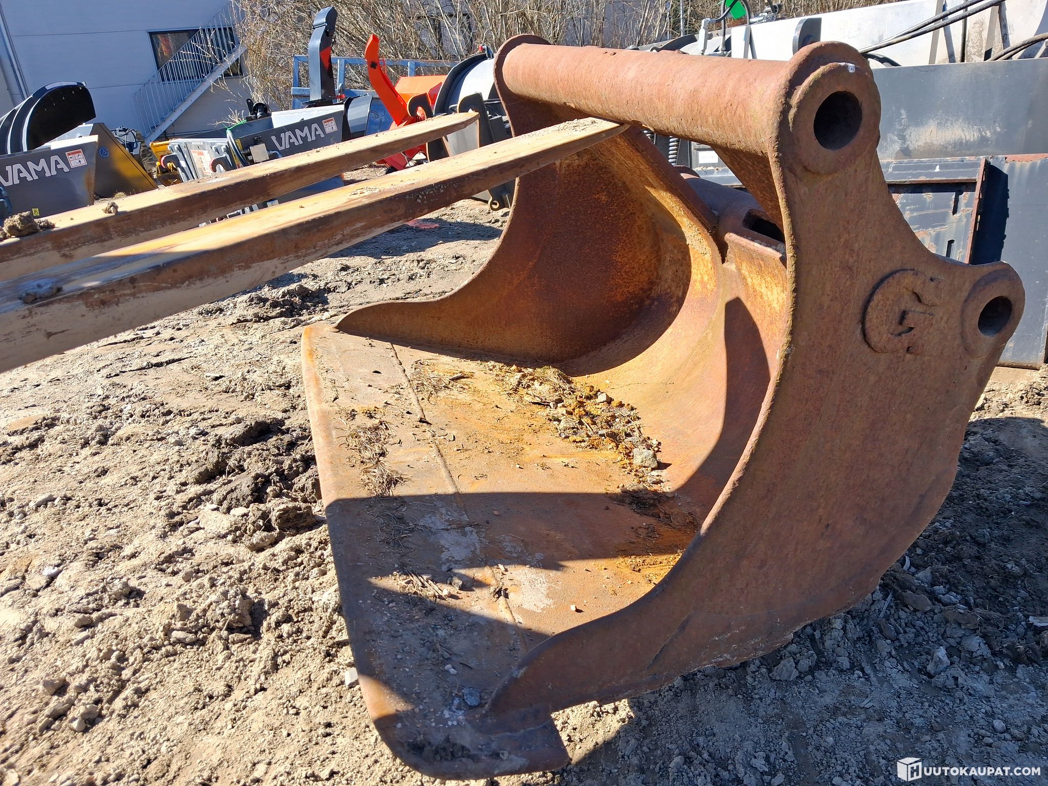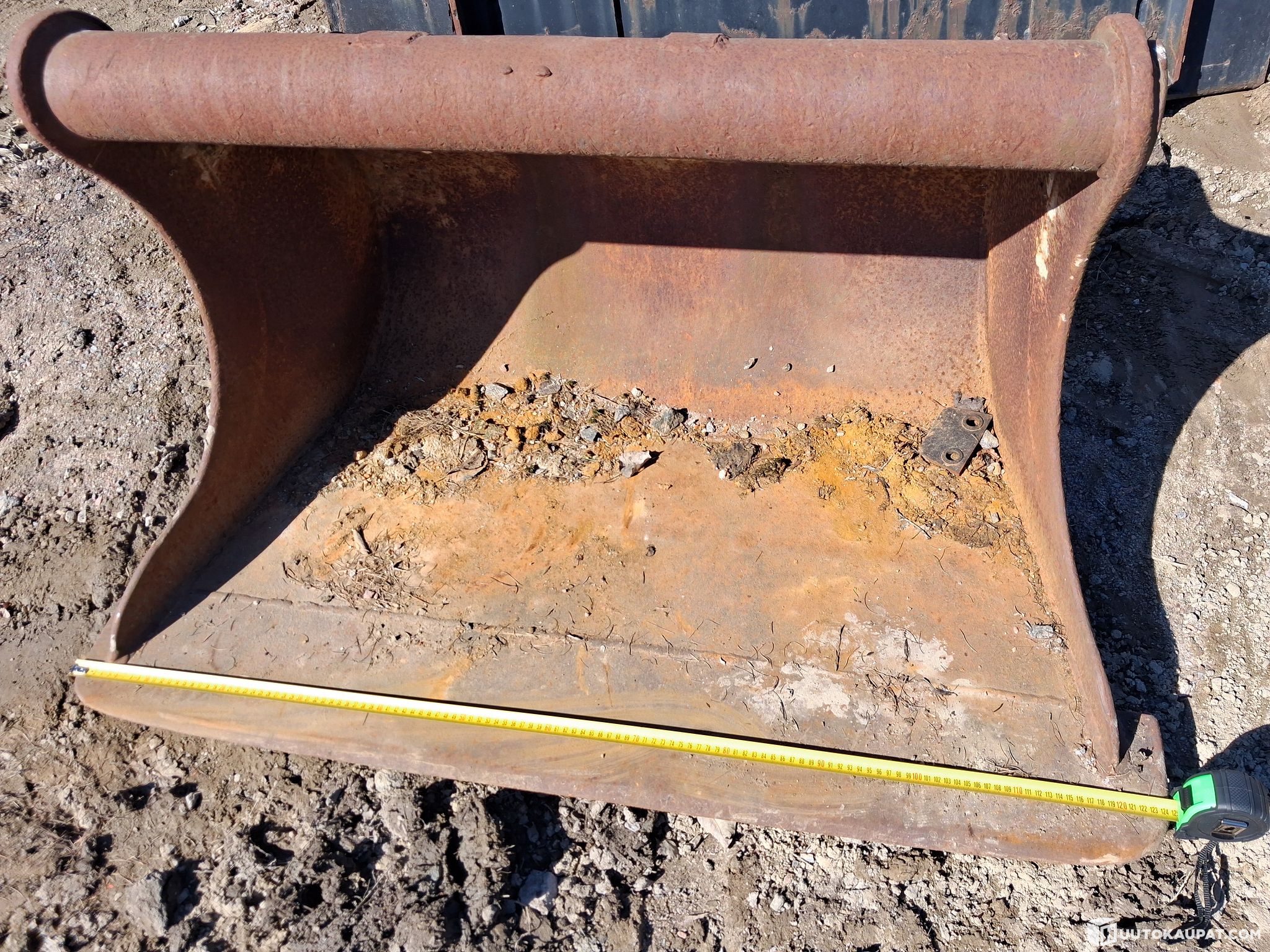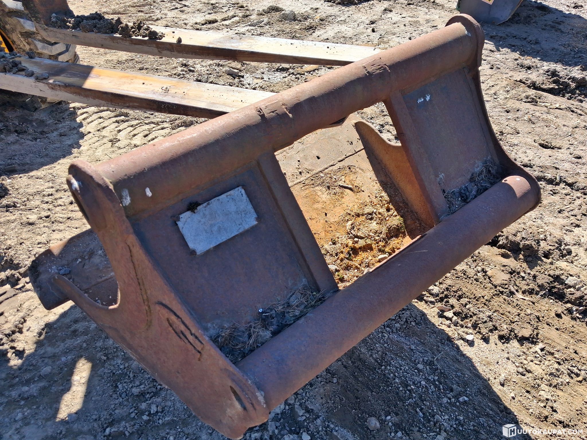 Paljon elämää nähnyt kaivinkoneen kauha, ilman kiinnikettä.
