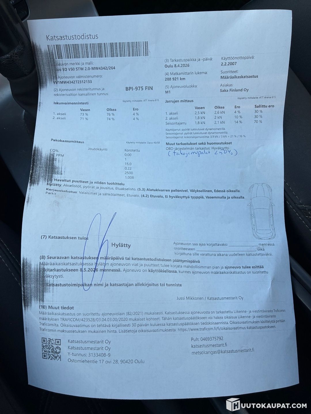 Auto mennyt katsastuksesta hylkyyn välyksellisen alatukivarren pallonivelen takia. Edessä oikealla. Katsastuksessa tullut korjauskehotus vääränlaisista parkkivaloista.