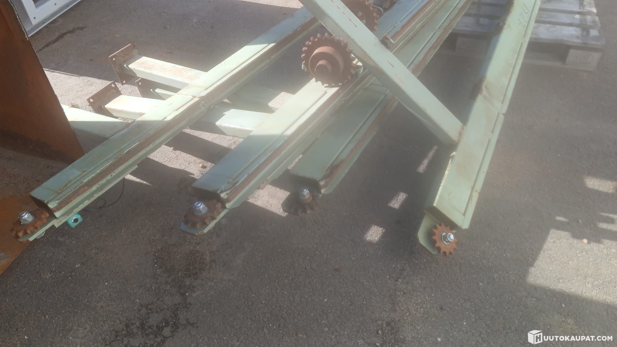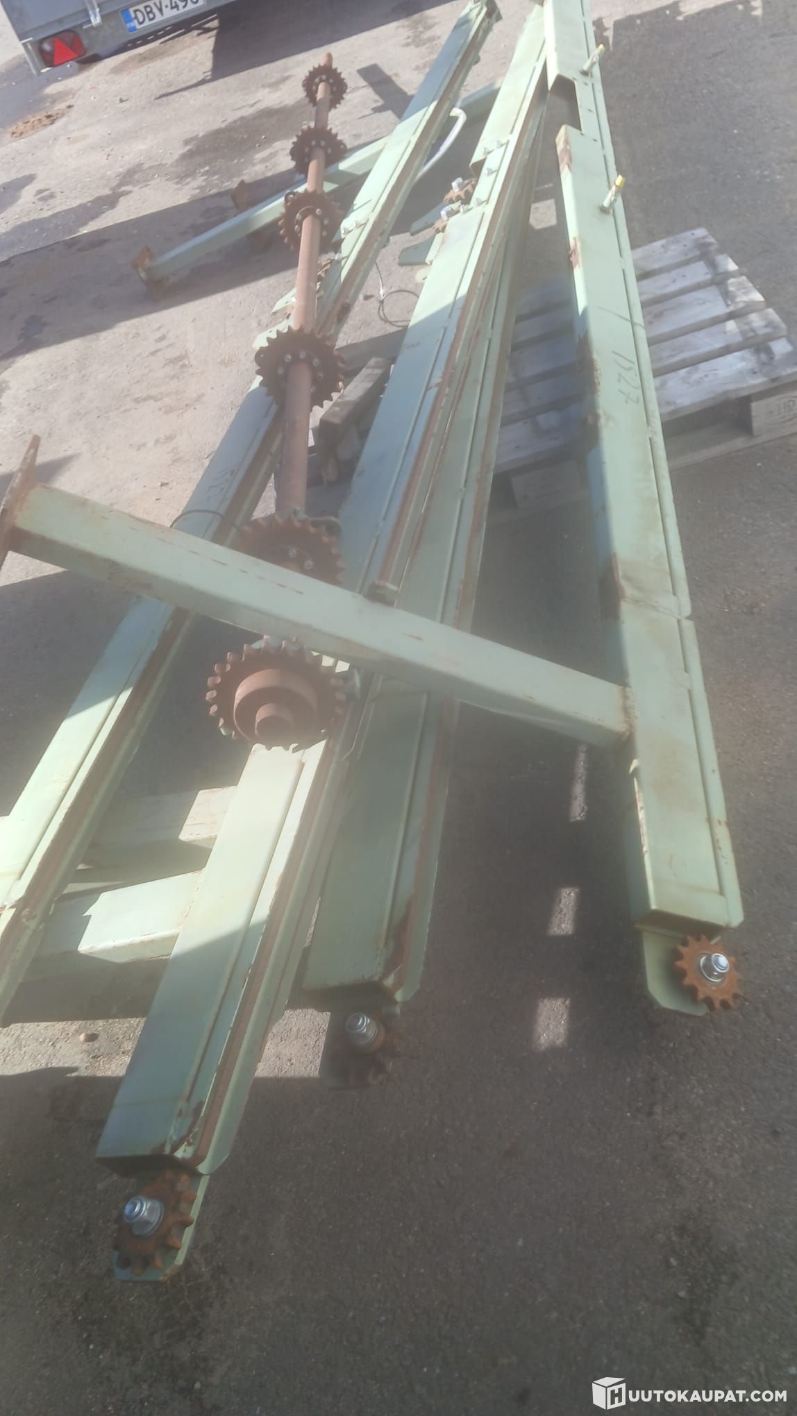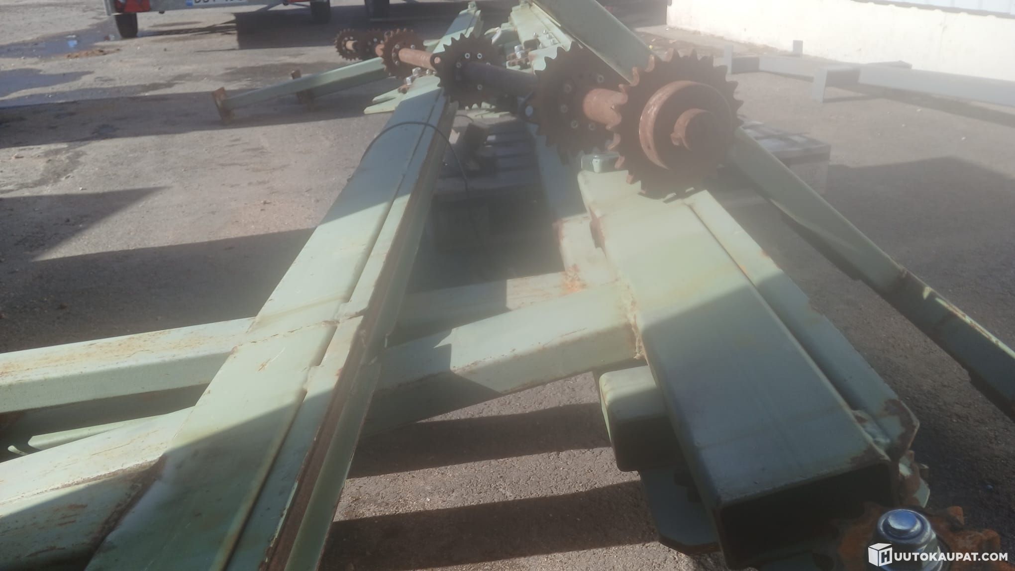 Käytetty tukkipöytä. Runko, akseli, laakerit, rattaat.