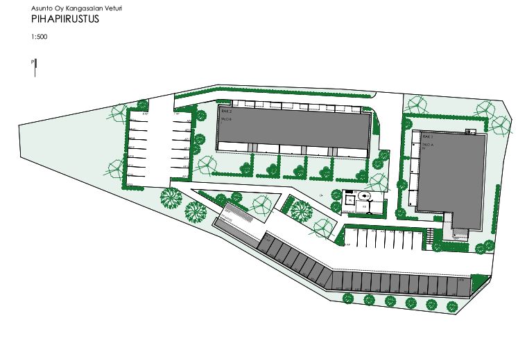 As Oy Kangasalan Veturin pihapiirissä osoitteessa Junatie 36, 36240 Kangasala, sijaitsevia autopaikkoja 2kpl sekä 9kpl autokatospaikkoja, kaikissa sähkötolppa.