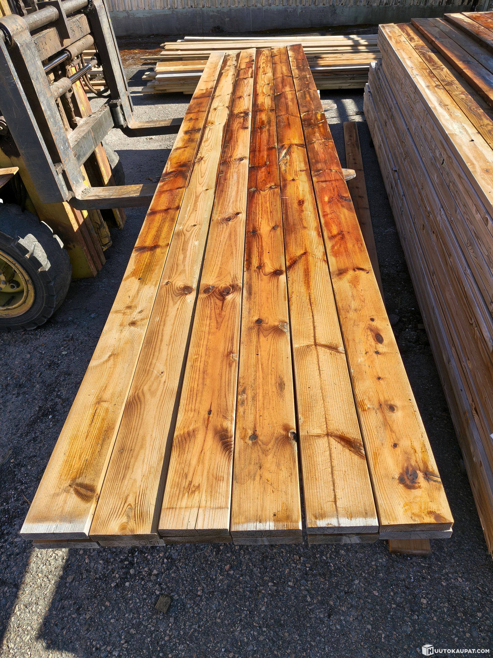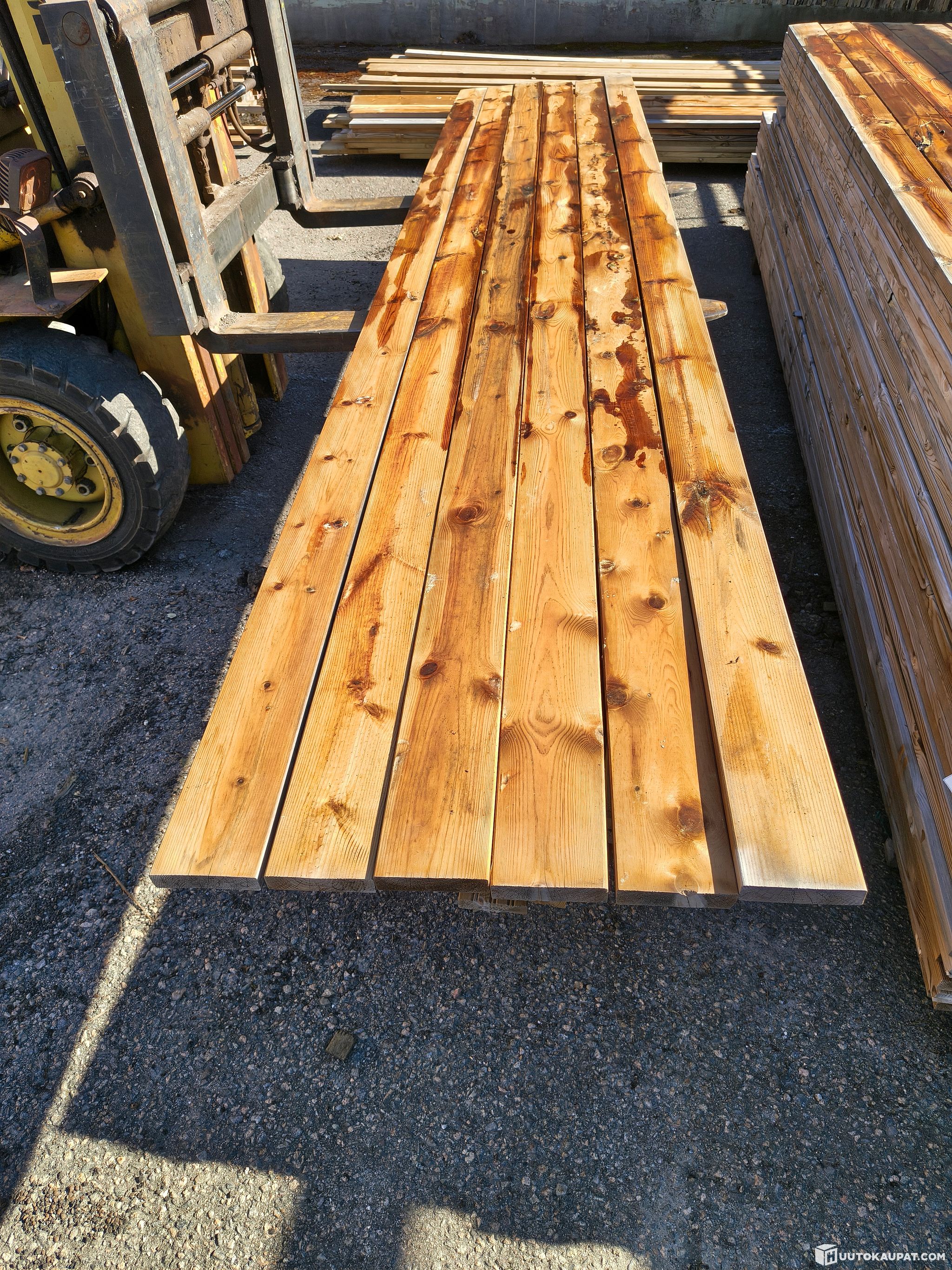 66 kpl erä ruskeakyllästettyjä sileähöylättyjä 28x120 mm 2 -laadun terassilautoja. Standardista poikkeava lautojen pituus, eli 4,01 m. Yhteensä 264 m, millä kattaa noin 32 neliön alan. Laudat ovat märkiä ja sen vaihtelusta johtuen väri on varsin kirjavaa. Jokaisen laudan laatu näkyy kuvissa. Väri tasaantuu lautojen kuivahtaessa. Valkoiset "tahrat" ovat pintaan tihkunutta kyllästysaineen suolaa. Terassipesurilla tai painepesurilla lähtevät pois ennen öljykäsittelyviimeistelyä.