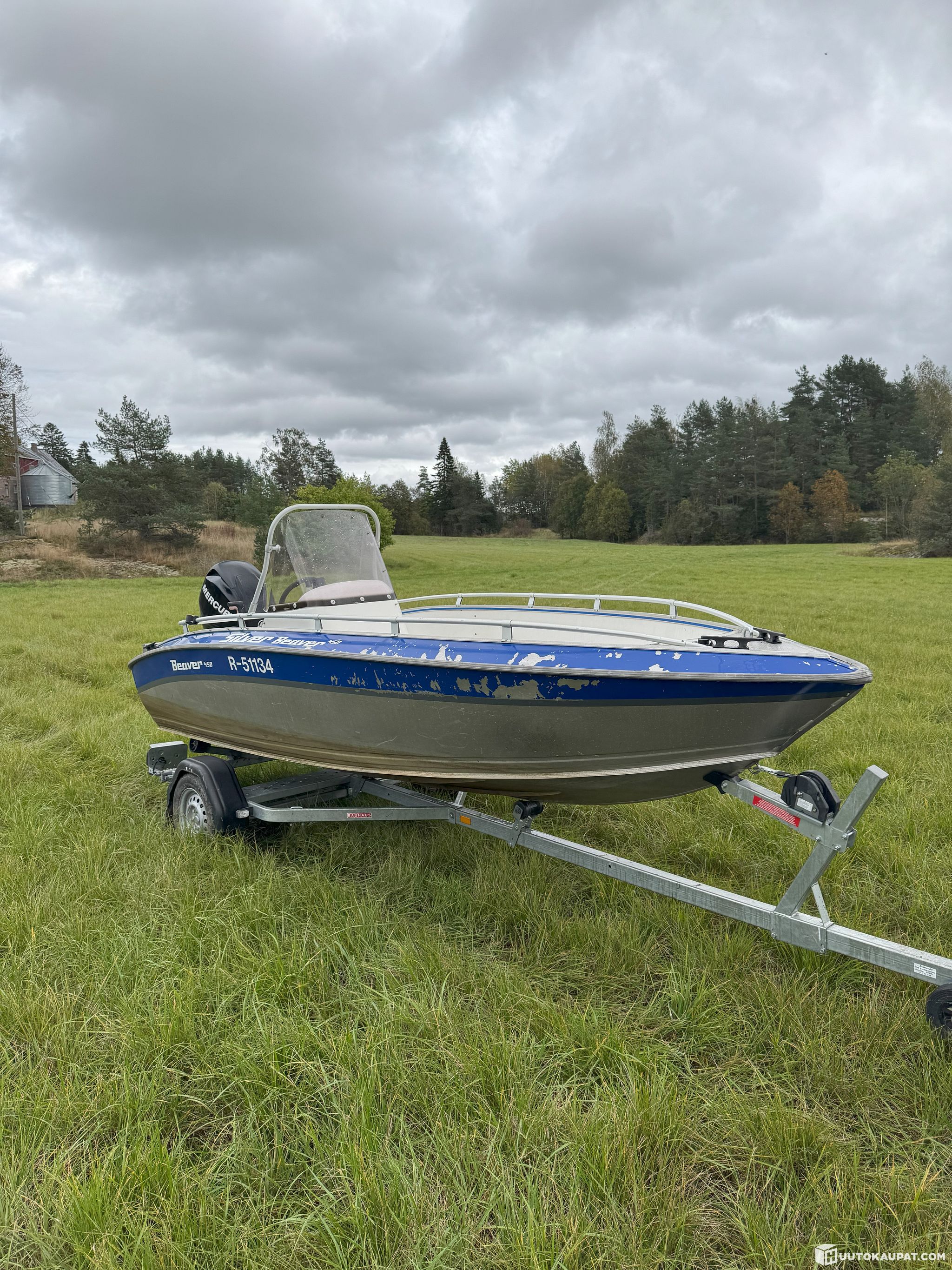 Myydää kuvan mukainen Silver Beaver 450 sekä Mercury 40ELPT -07 perämoottori trailerin kanssa. Iän tuomaa kulumaa, mm hilseillyt sininen maali. Mukaan plotteri/kaiku. Kevyt Hydraulinen ohjaus. Edessä paikka toiselle akulle ja teline toiselle moottorille. Uusi potkuri.