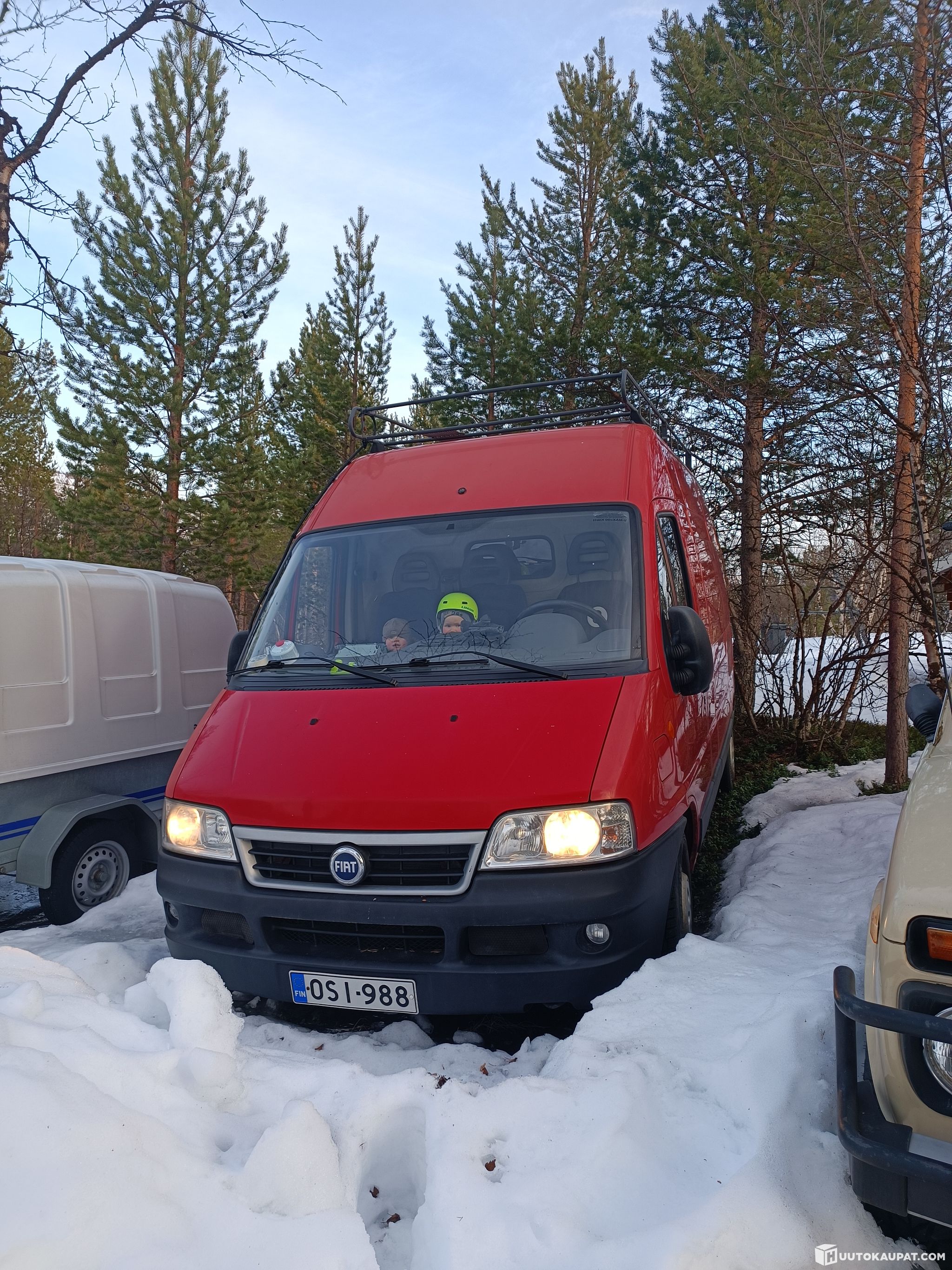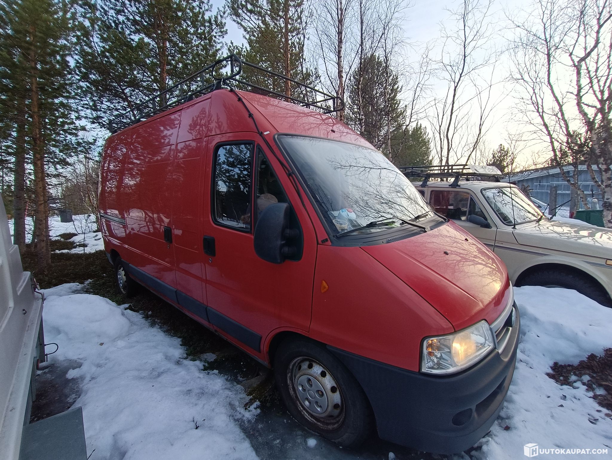 Katolla täysi mittainen kattoteline ja takaovessa tikkaat katolle. Takakulmien muovinurkat tallessa. Auton mukana tulee avattava pystyikkuna kuormatilaan ja pätkä korvauspeltiä.