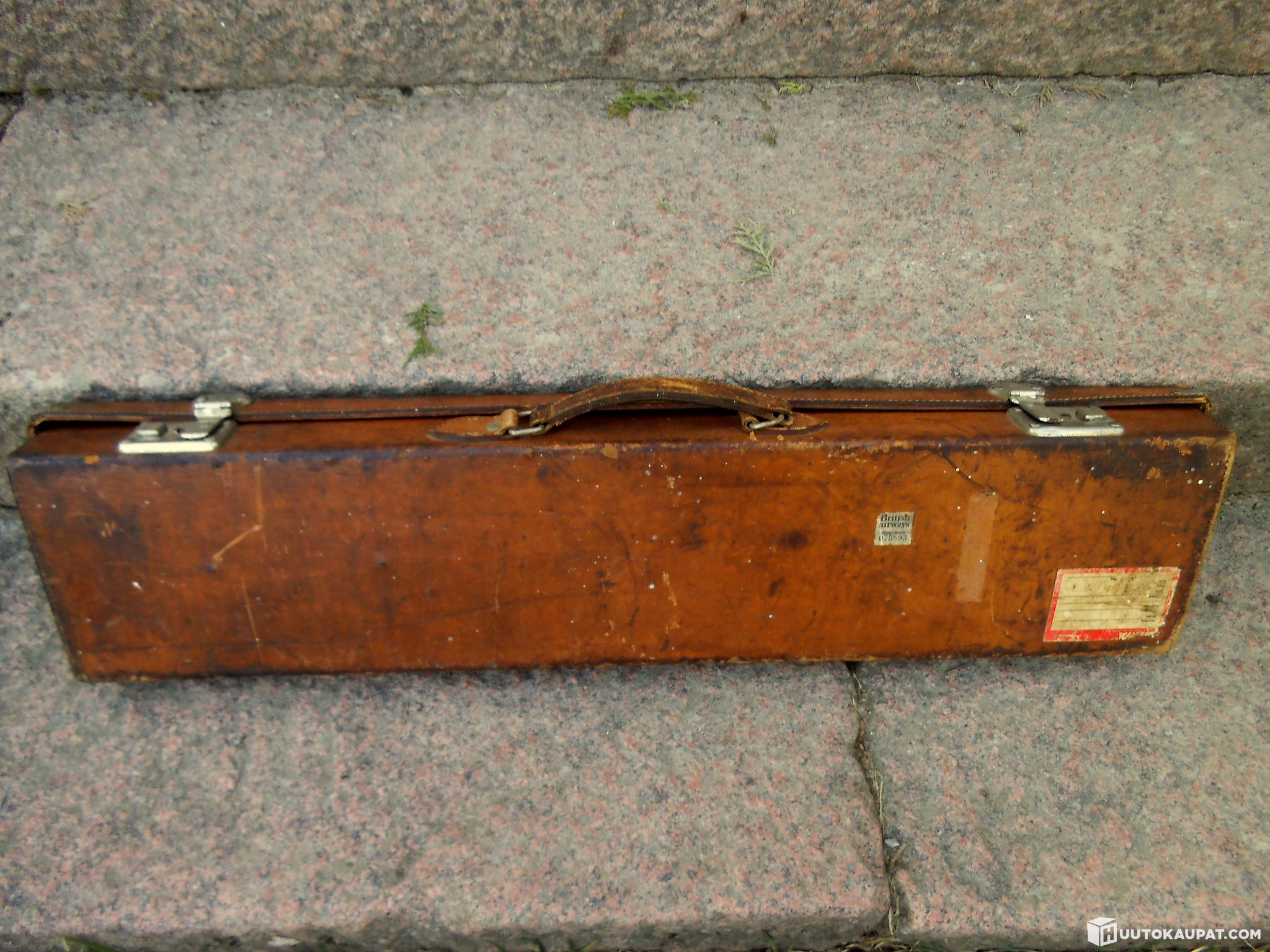 Laatikossa työkaluja ja rasvaloota, laatikon pohjassa ikivanhoja lentorahtitarroja mm. british airways että on nähnyt maailmaa.