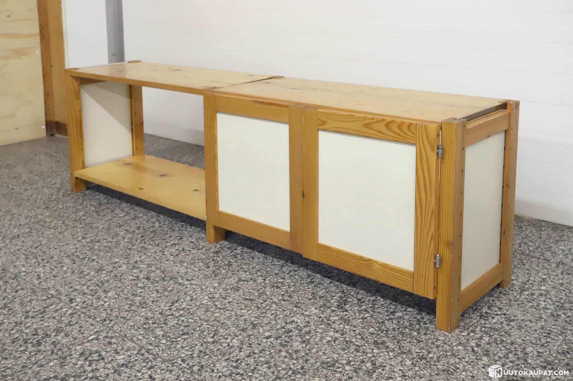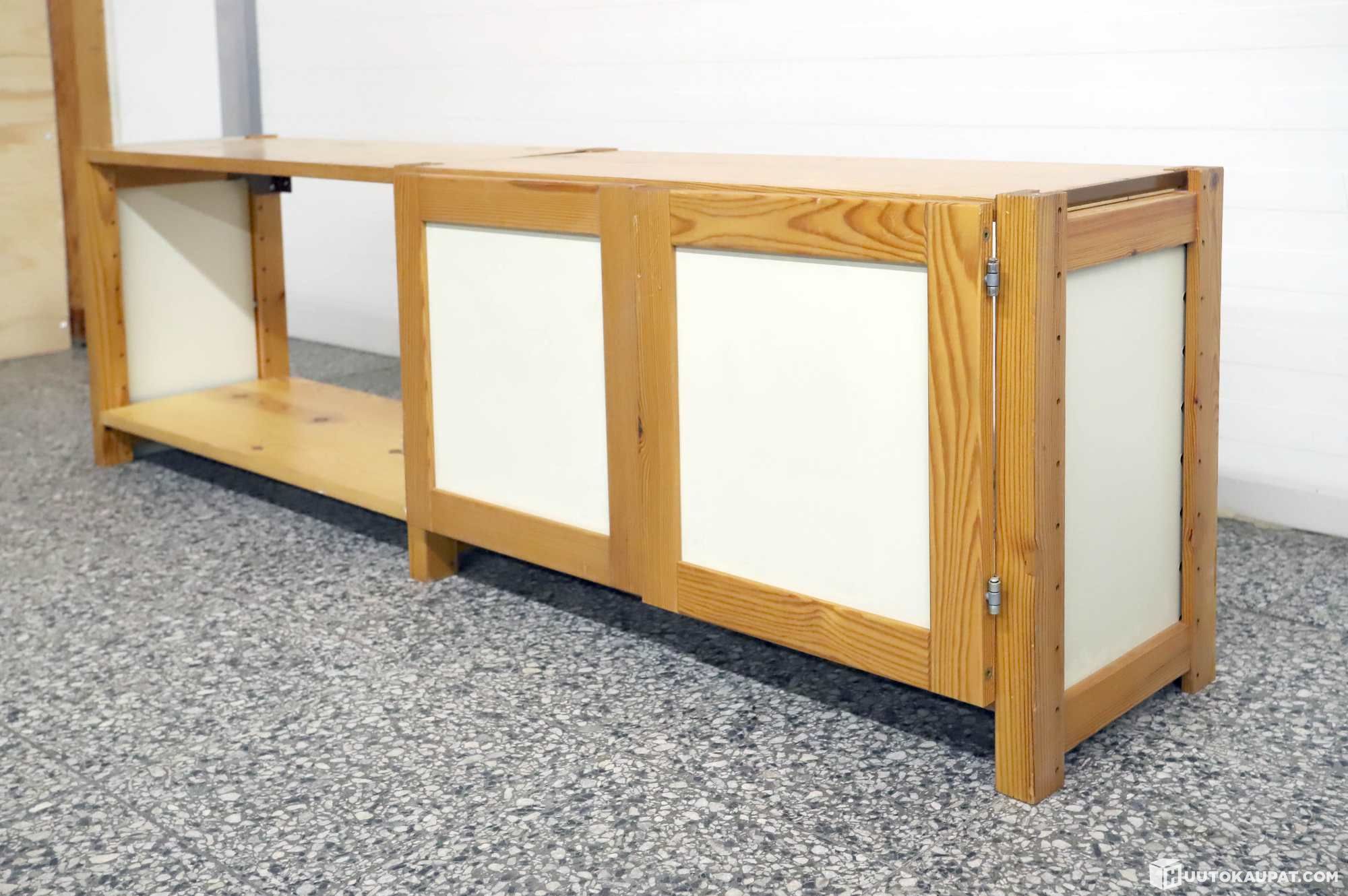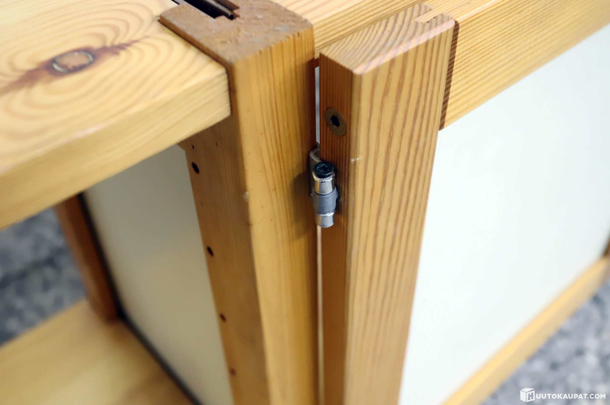 Toisen oven tapit eivät ole alkuperäiset. Hyllykkö täytyy kiinnittää seinään kuvien kulmaraudoilla tai hyllykköön voi laittaa tukiristikon jotta hyllykkö on tukeva.