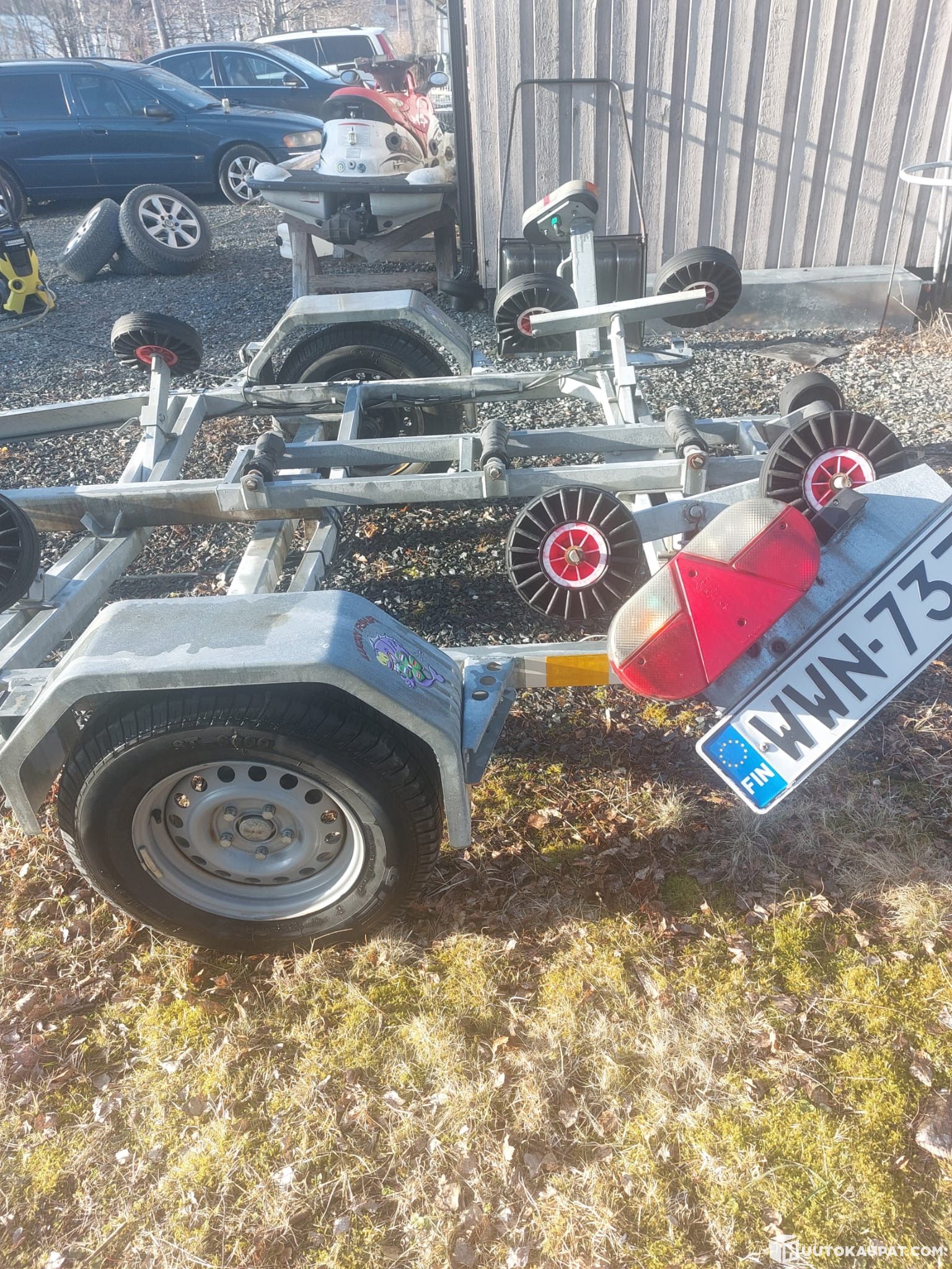 Perävaunu soveltuu erinomaisesti veneen kuljetukseen ja säilytykseen. Kyseessä keskiakseliperävaunu.