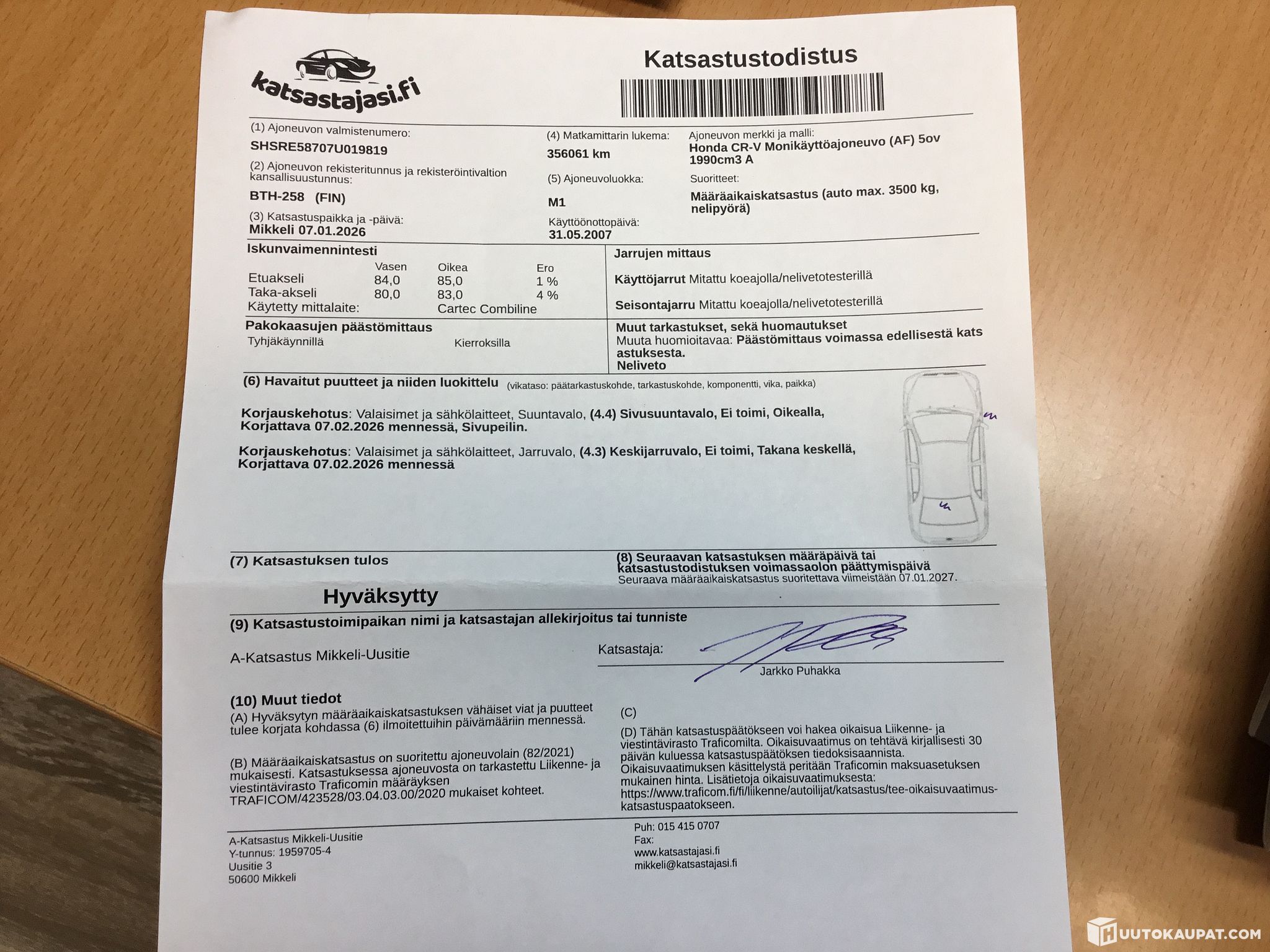 Ajoneuvolla on tehty lyhyt koeajo. Koeajolla havaitsimme: