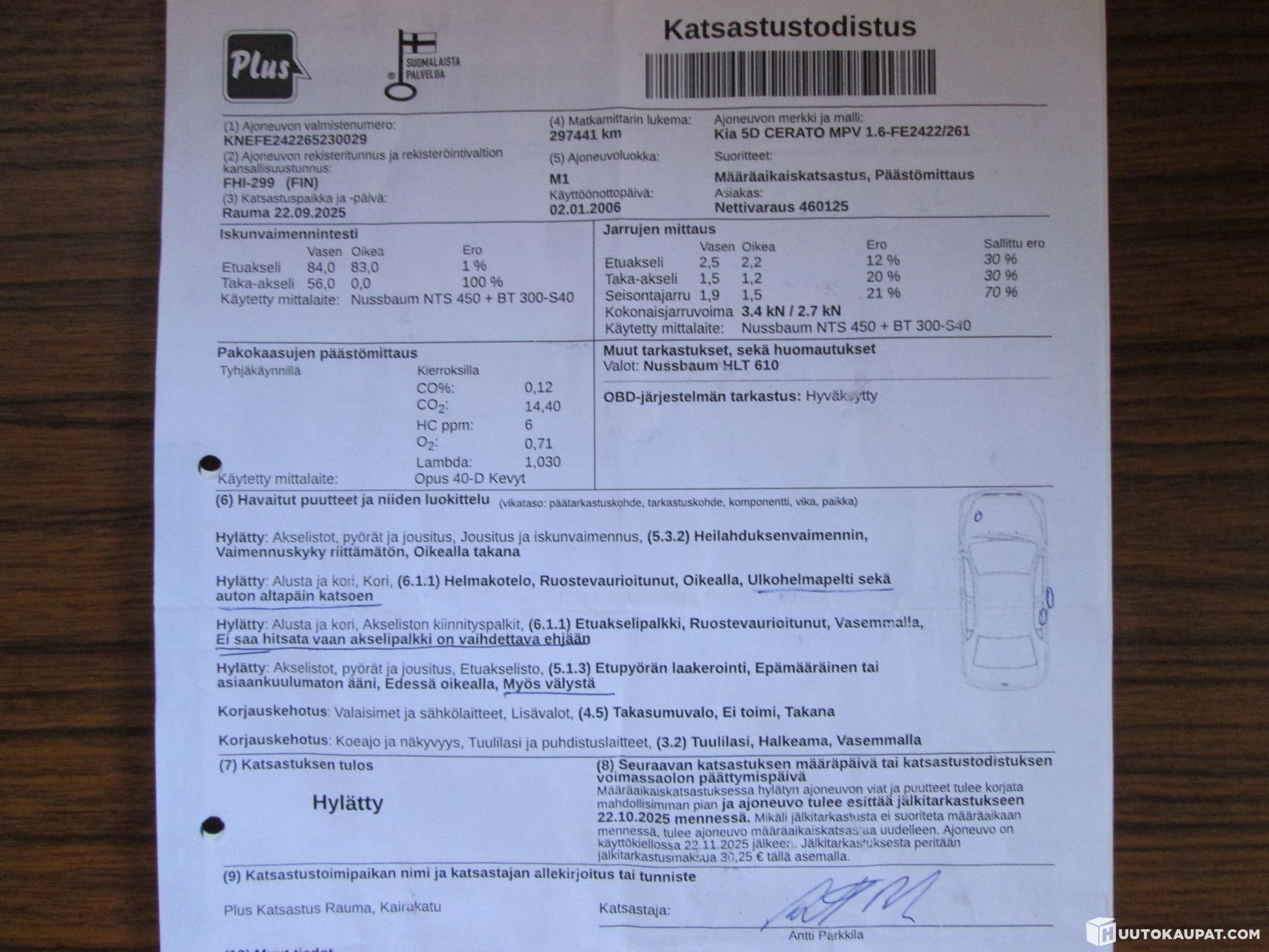 Katsastuksen vikalappu näkyy viimeisessä kuvassa.