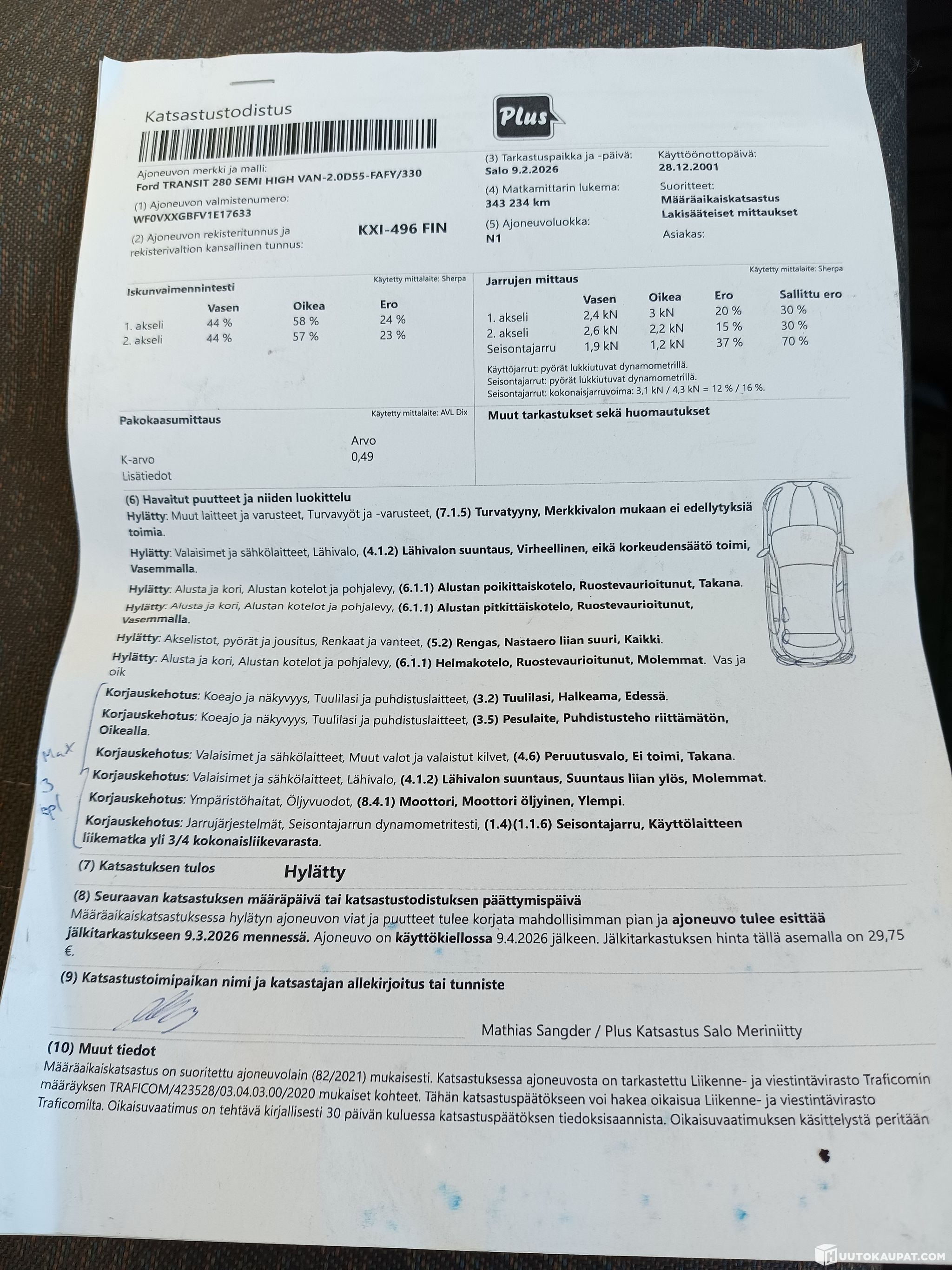 9.2.2026 Määräaikaiskatsastus hylätty. Käyttökiellossa. Kts. viimeisen kuvan vikalista.