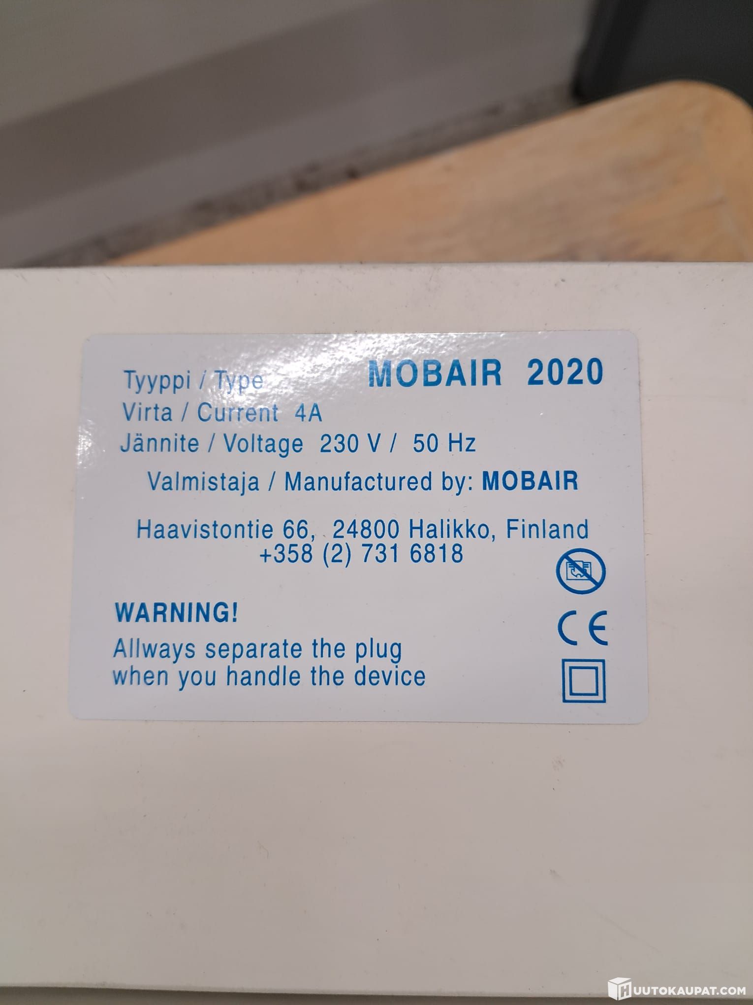 Suomalaista valmistusta — valmistaja Mobair Oy, Halikko, Finland.