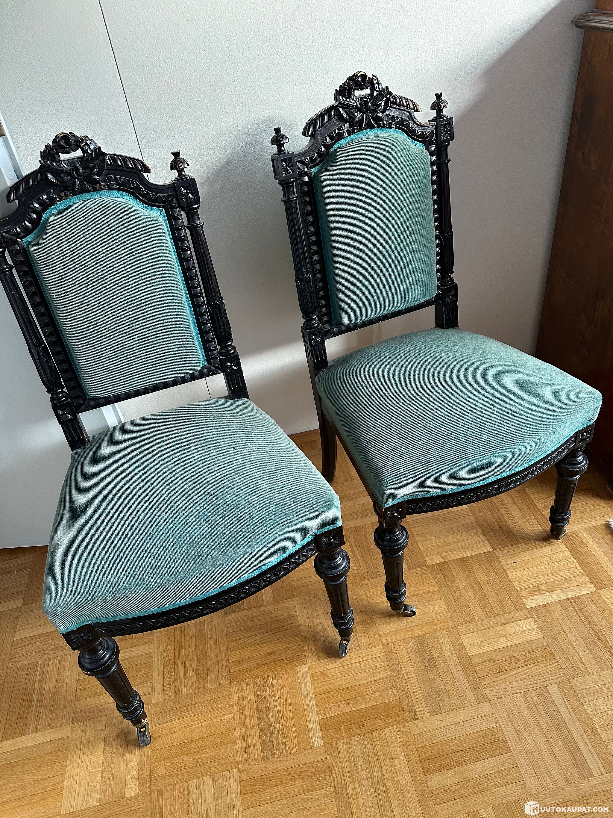Antiikkiset tuolit. Päällinen turkoosia samettia