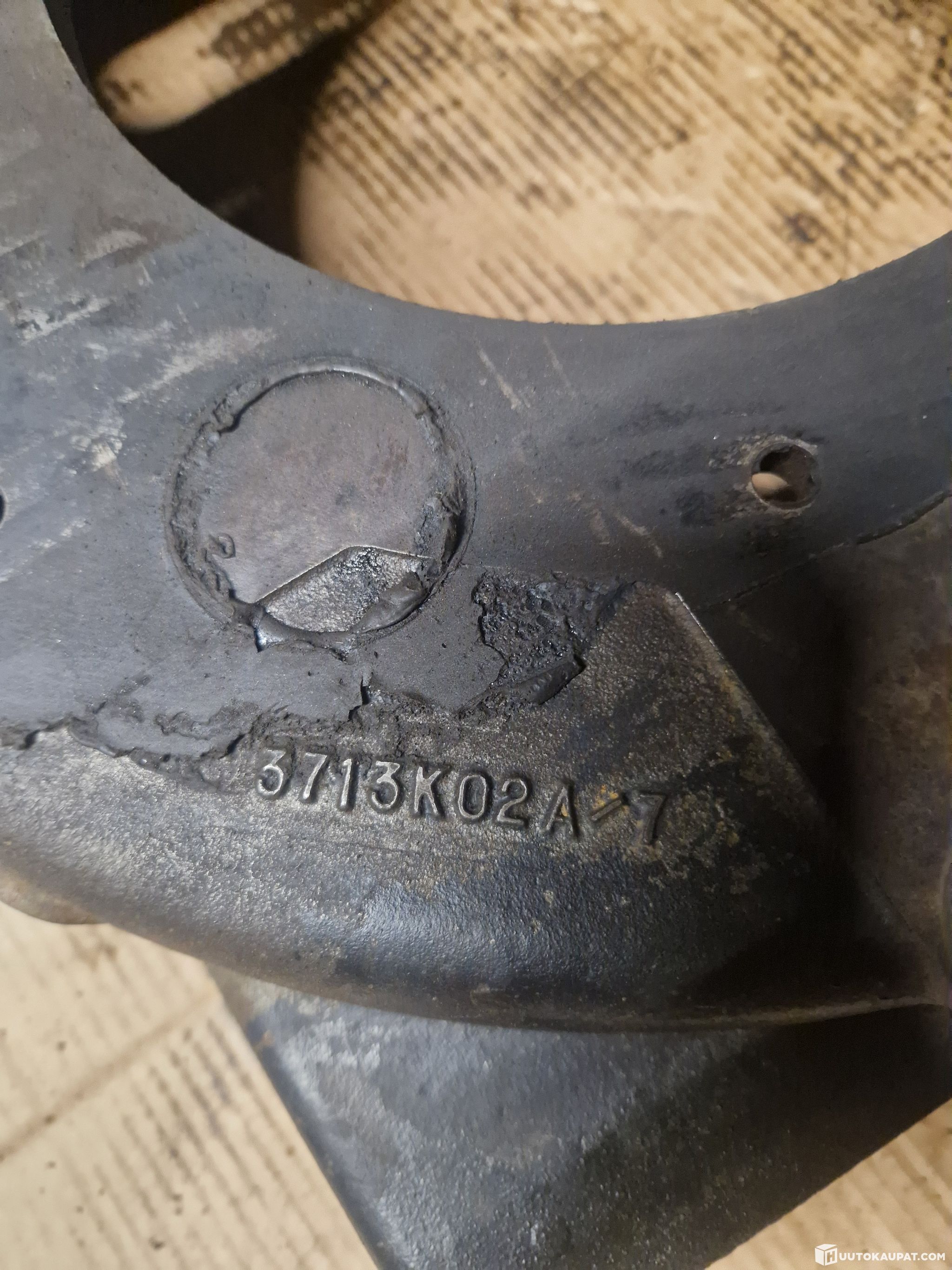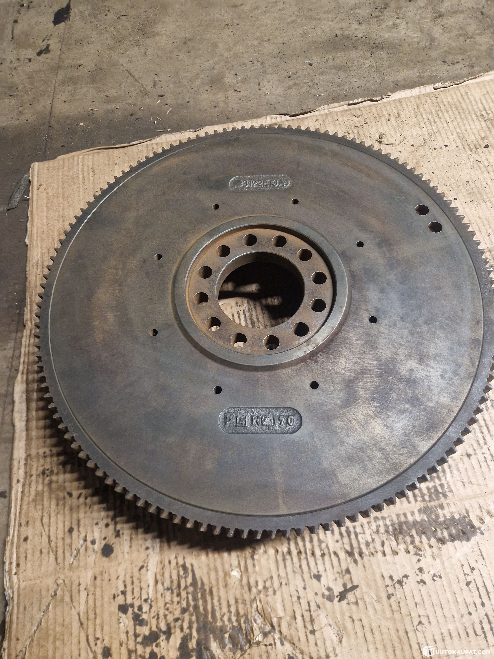 Huutokaupan varastoon jääneet Perkins moottorista puretut vauhtipyörä ja sen kotelo.