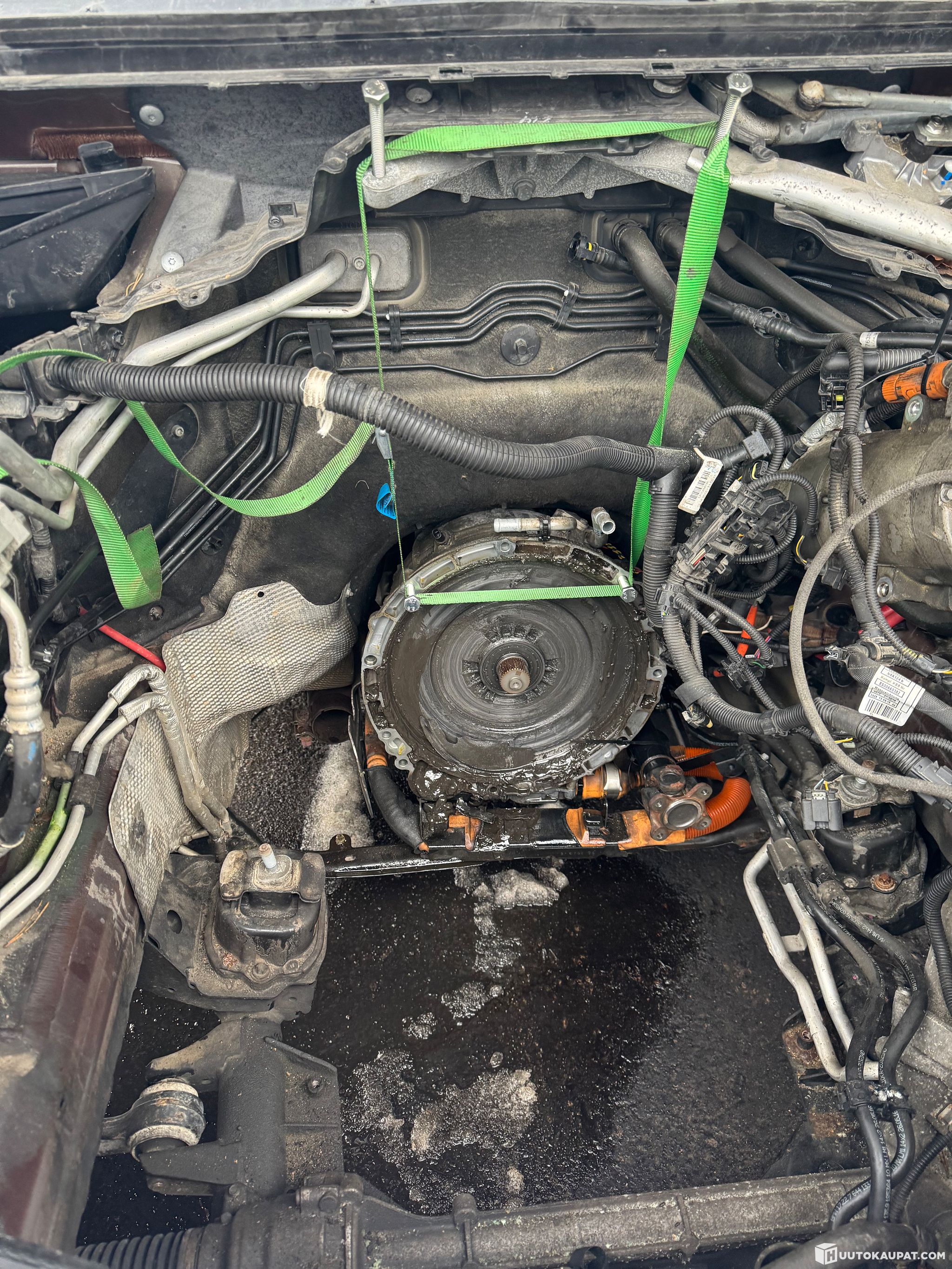 Vaihteistovaurio (vaihteistotyyppi GA8P75HZ). Nykyinen moottori on irrotettu autosta, vaihteisto on kiinni.