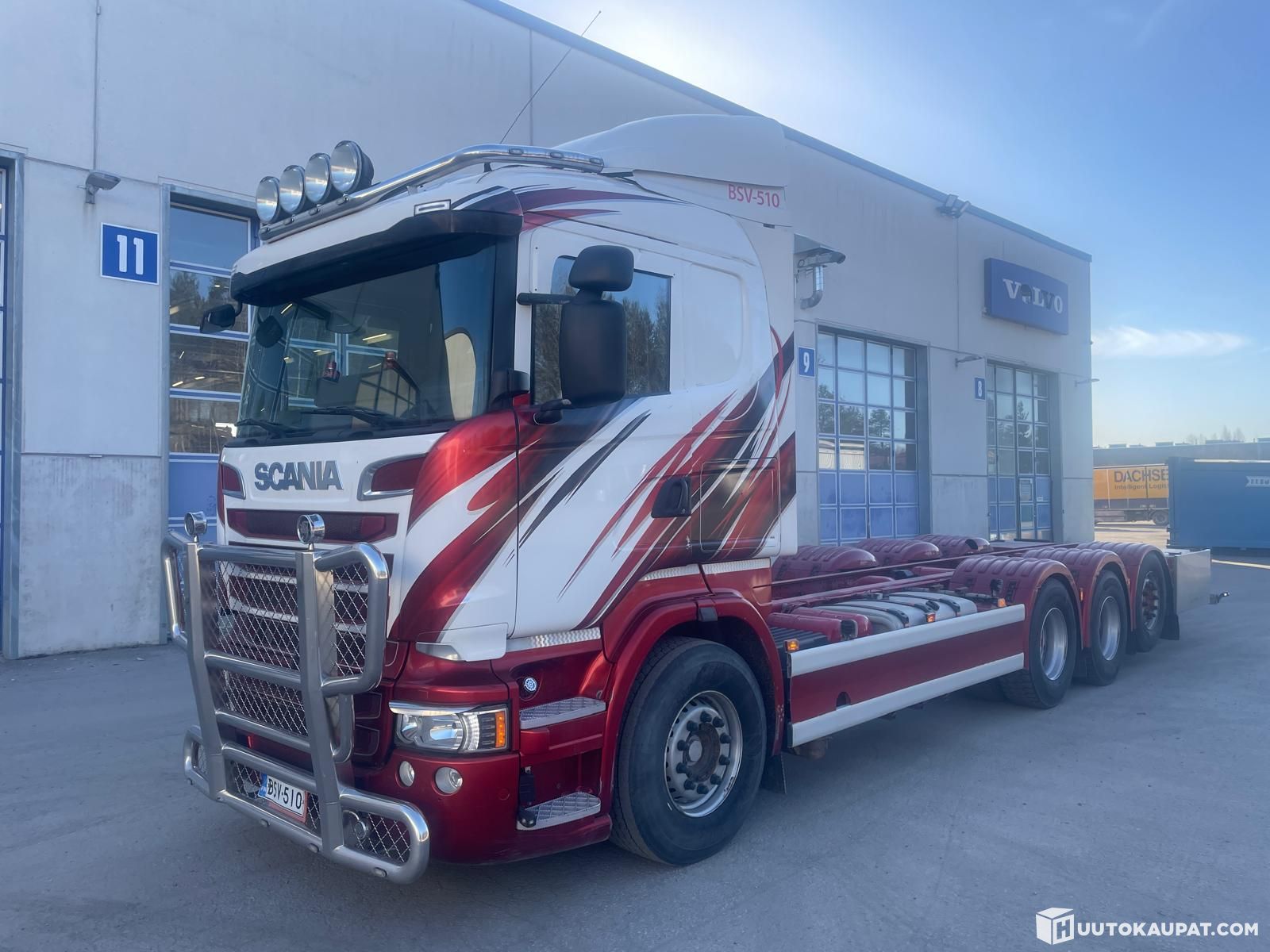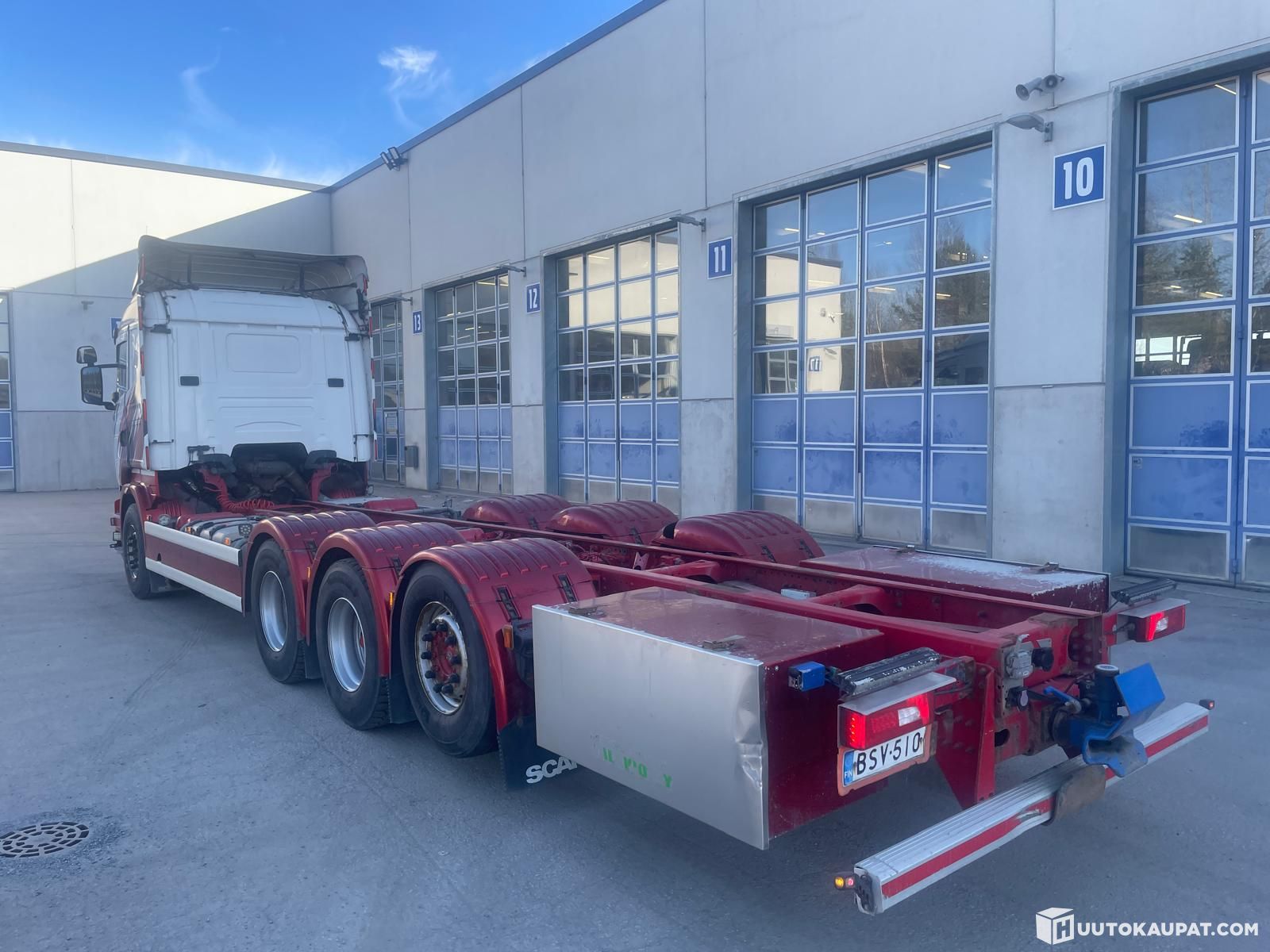 Kulmakoneinen Scania R520 8x4 alusta. Täysilma, ulosotto.