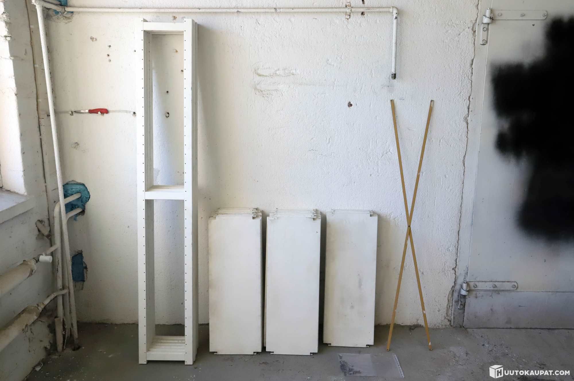 Päädyt ja hyllyt on maalattu valkoiseksi, likaa ja käytön jälkiä.