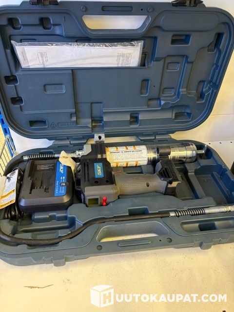 Akkukäyttöinen rasvapuristin, mukana itse laite, salkku ja laturi.