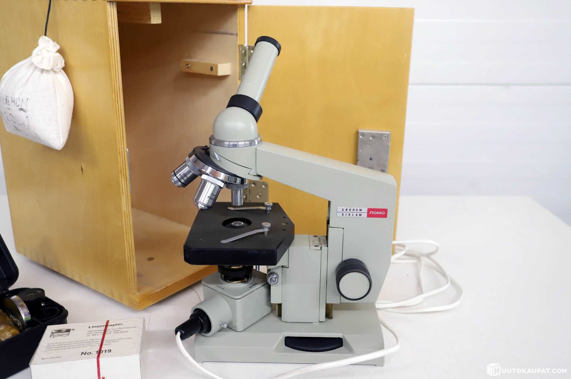 Lomo Biolam-mikroskooppi vanerilaatikolla.