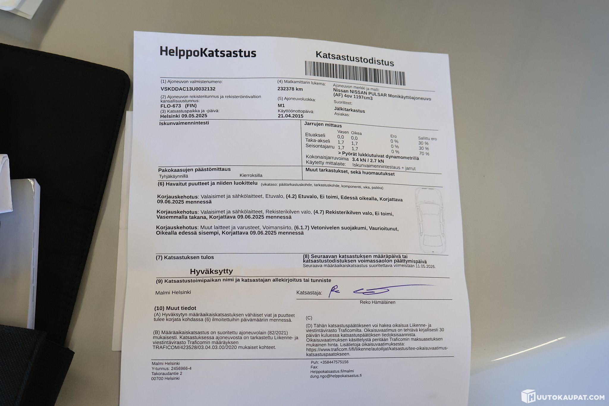 - Vauriot ja huoltokirja kuvissa.