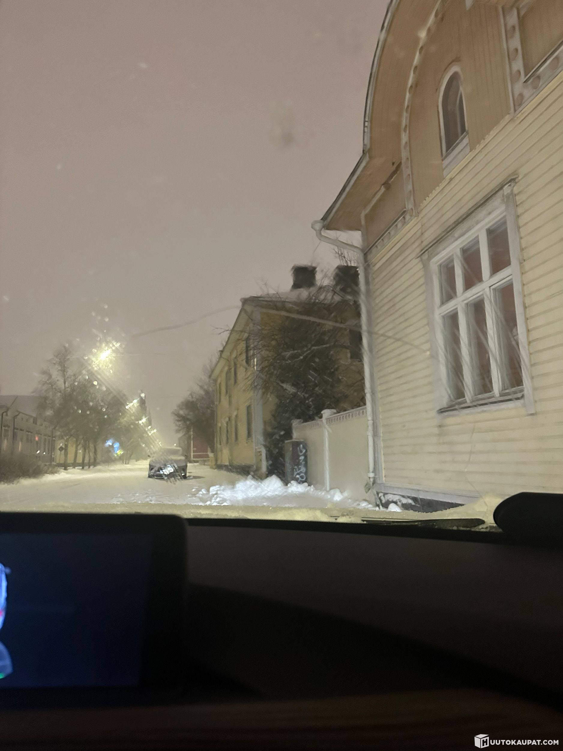 Naarmu auton kyljessä eturenkaan vieressä, ja kiveniskemä joka johti halkeamaan tuulilasissa.