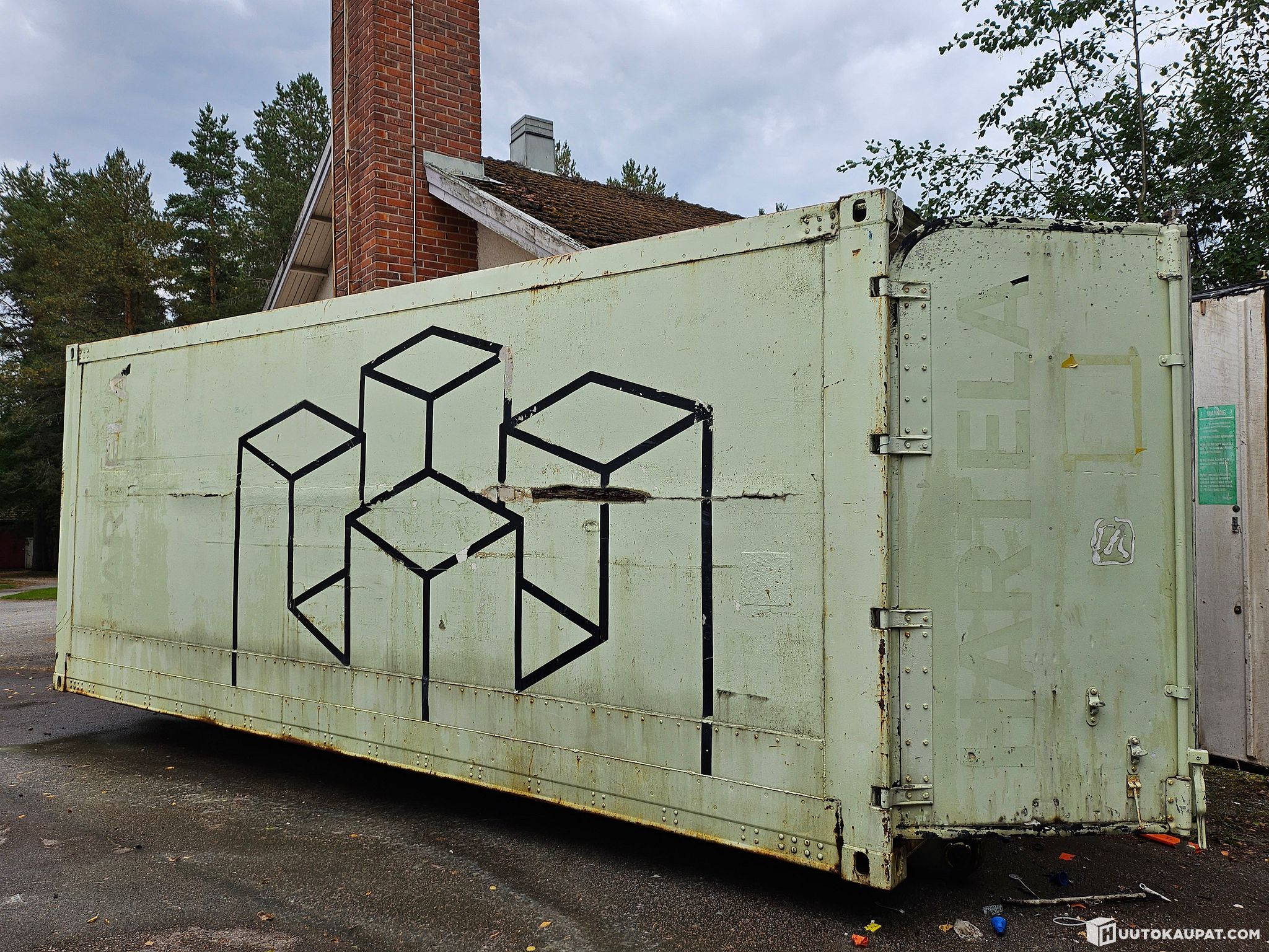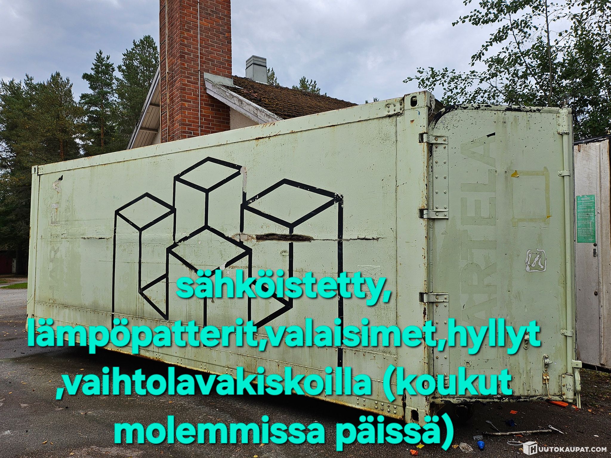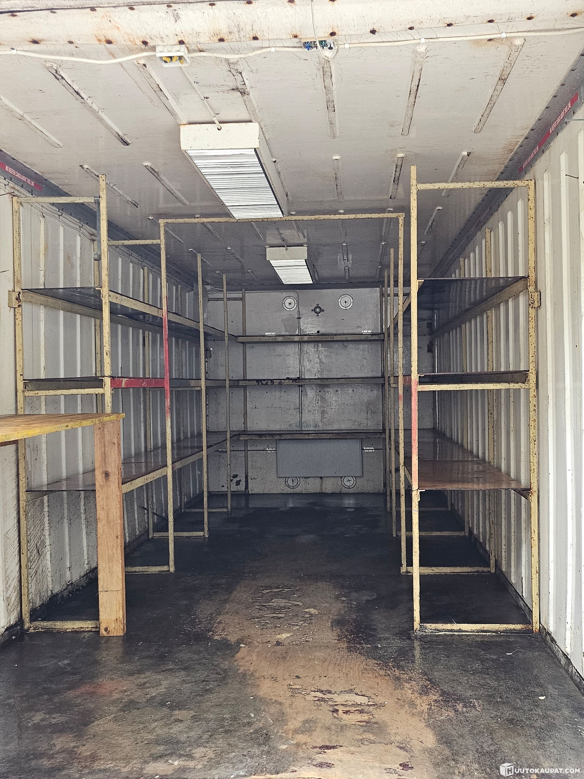 Lämpöeristetty kontti, sähköistetty, valaistus, sähköpatterit, hyllyt, pieni "haava" ulkopellissä
