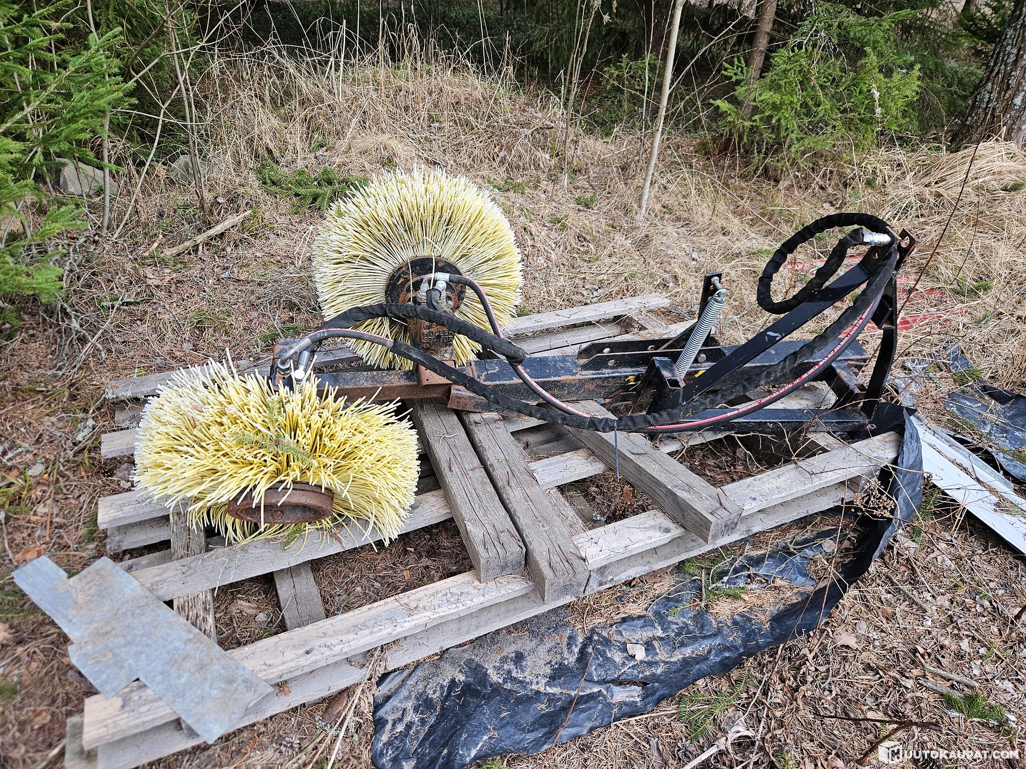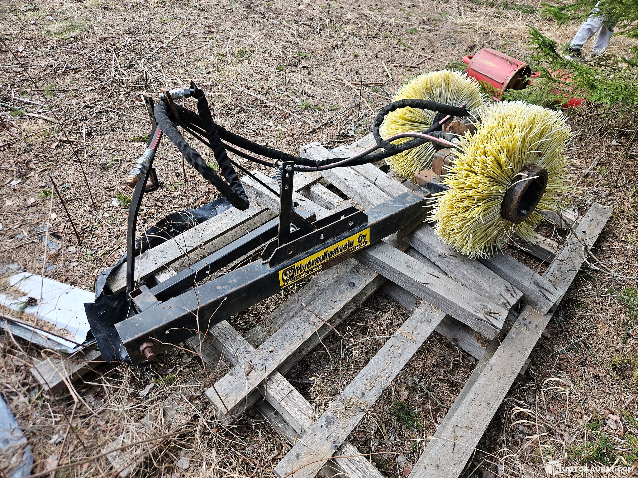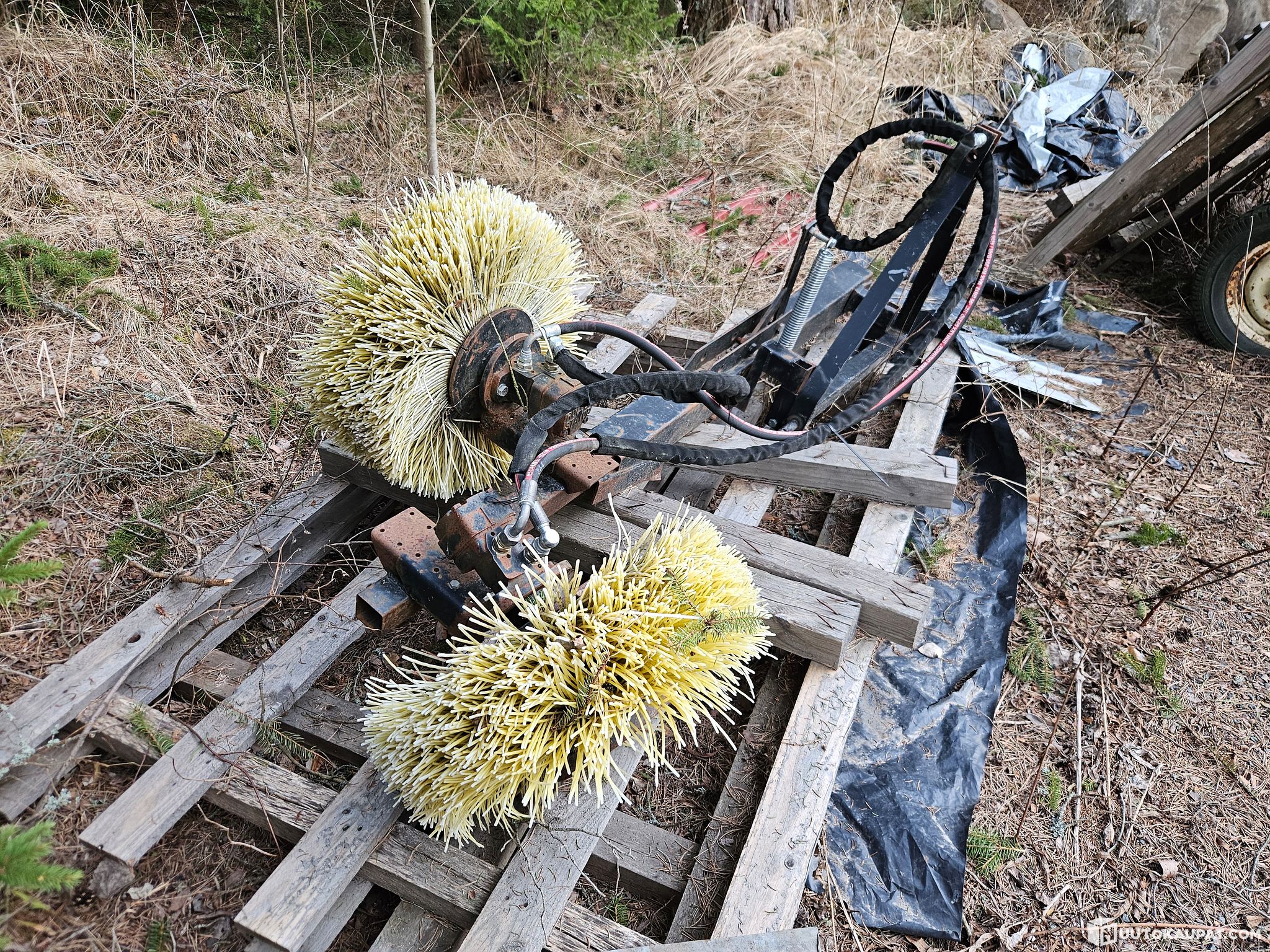 Hydraulipyöritteinen harjalaite traktorin perään, ollut mansikkapenkin puhdistuksessa.