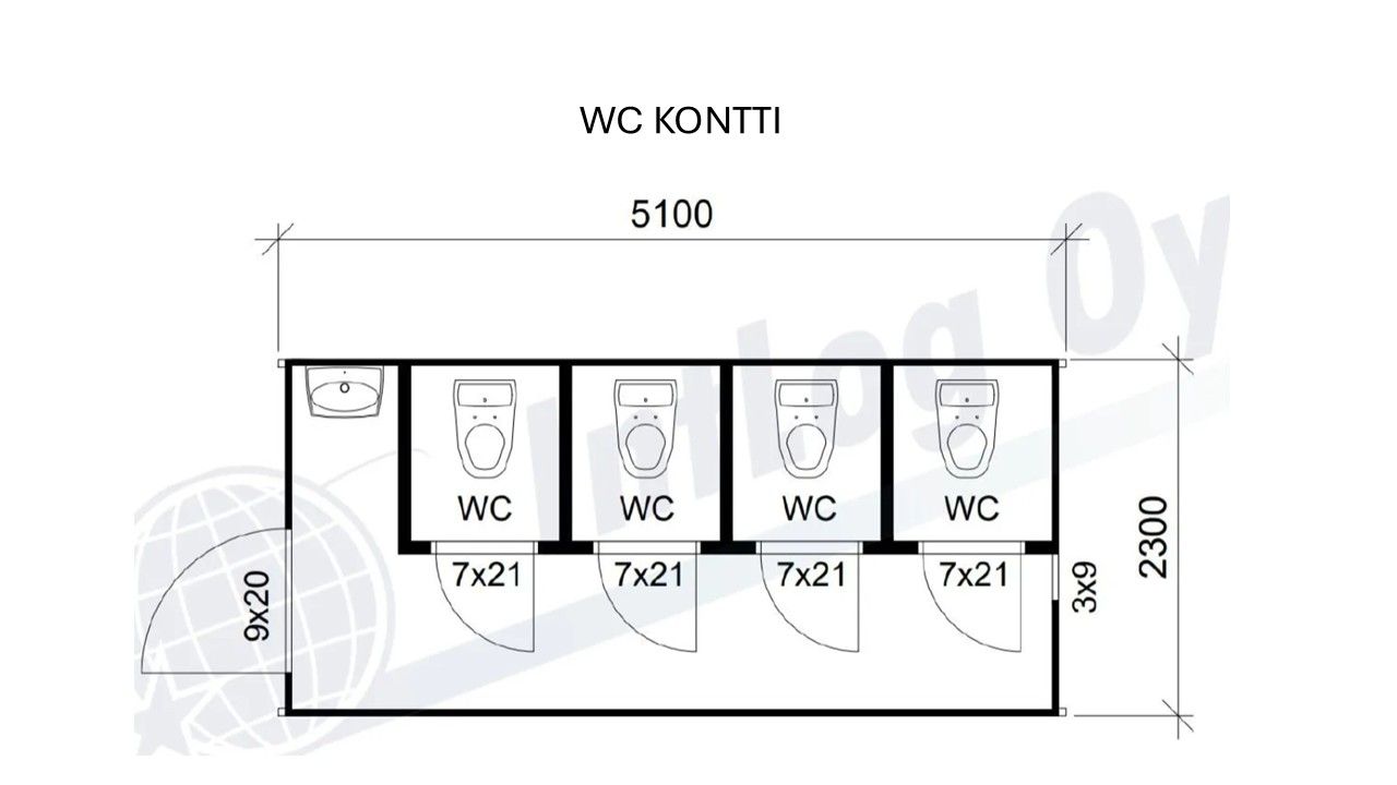 Eristetty wc kontti 4:llä wc-istuimella ja yhdellä käsienpesulavuaarilla.