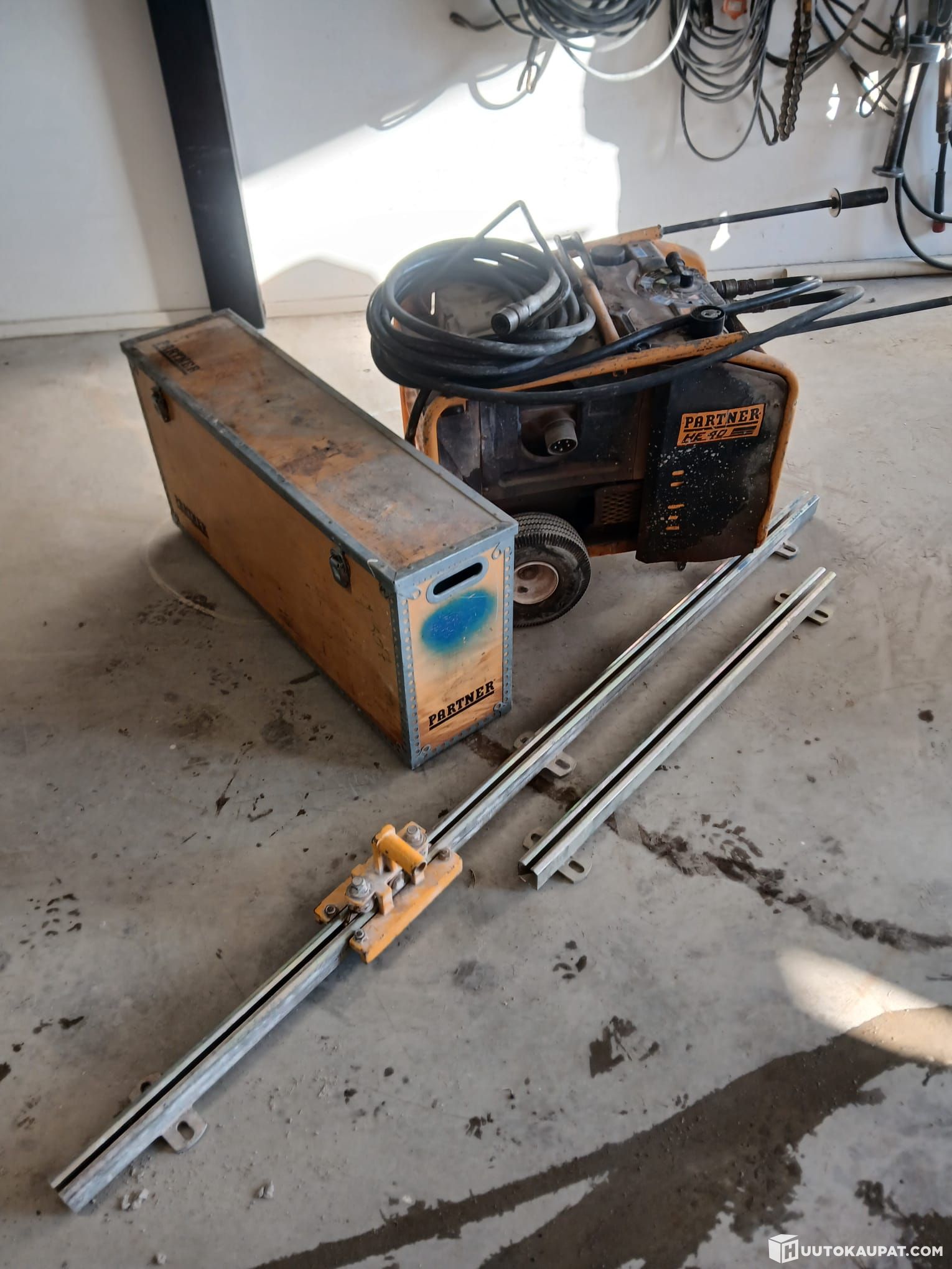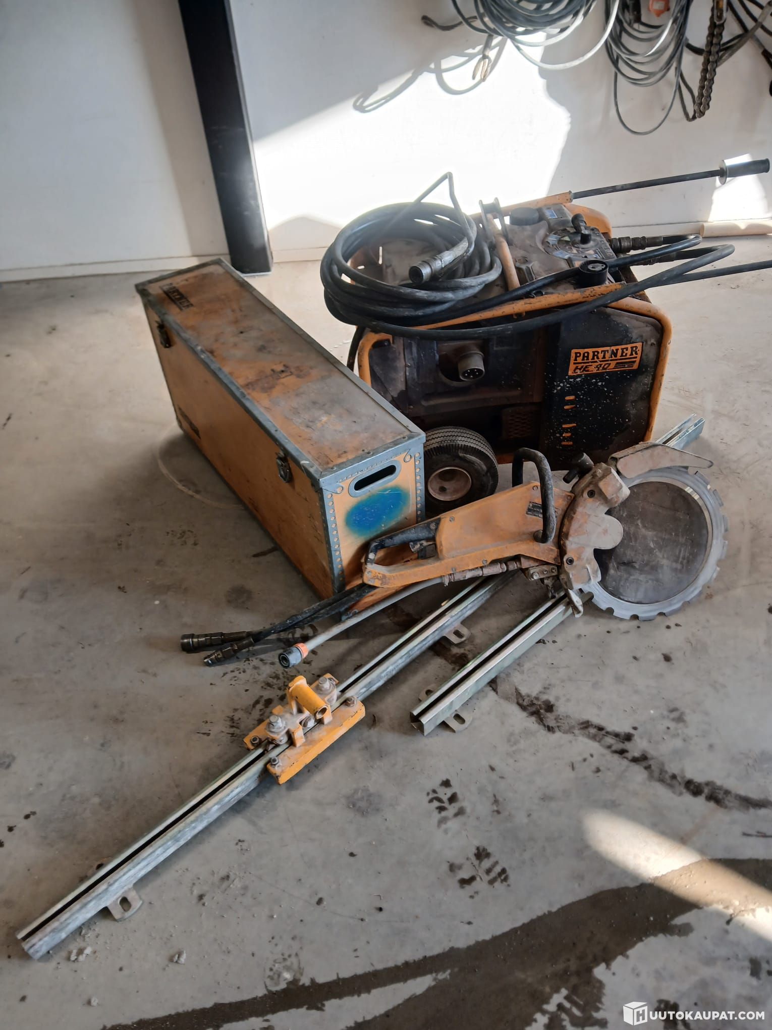 Testattu, toimiva saha. Sisältää kiskot ja laikkoja