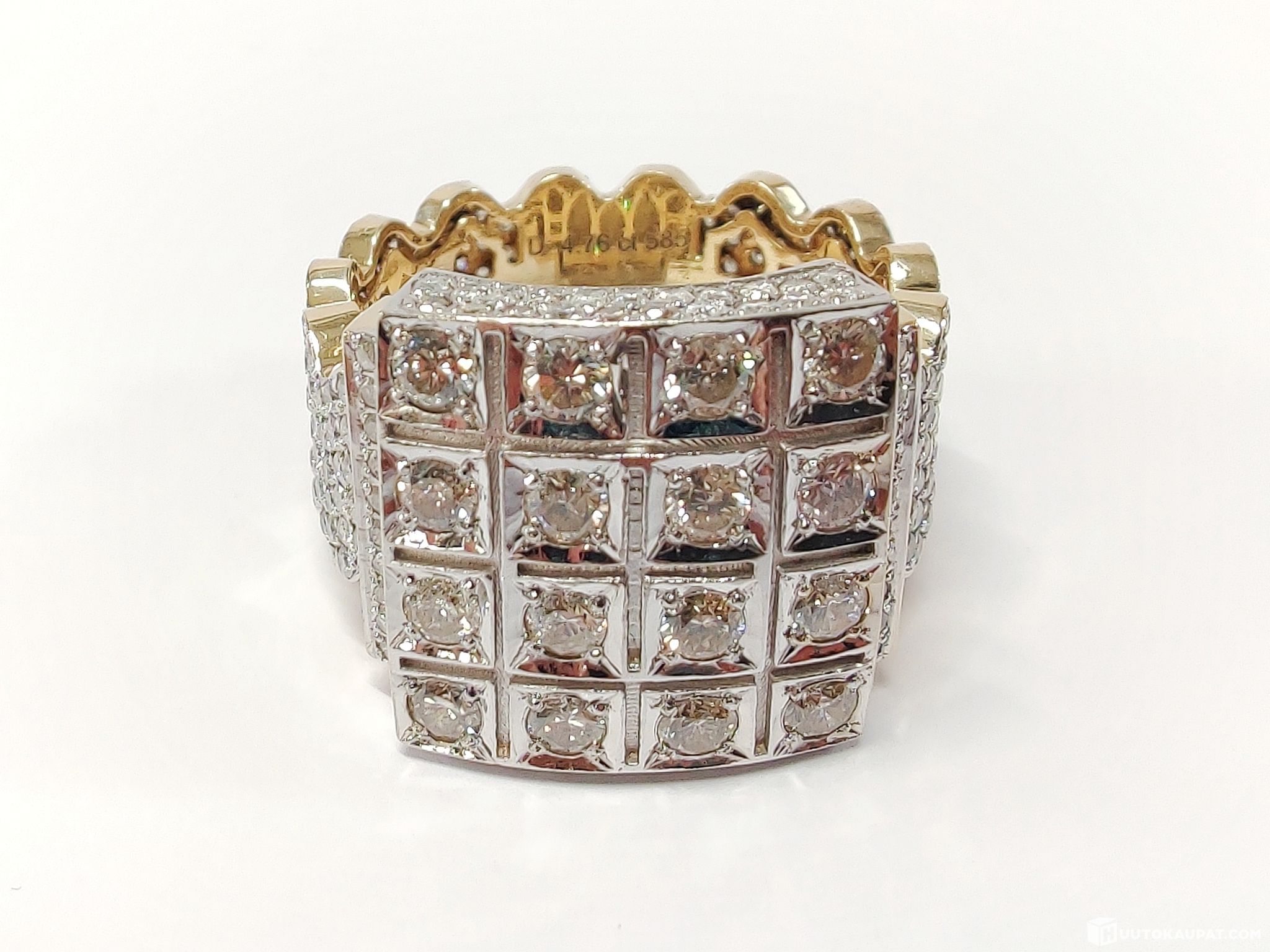 Huippunäyttävä miesten timanttikantasormus 585 14k kultaa. Kauttaaltaan timantein vuorattu "bling bling" -sormus upeaa käsityötä!