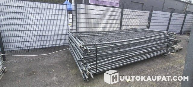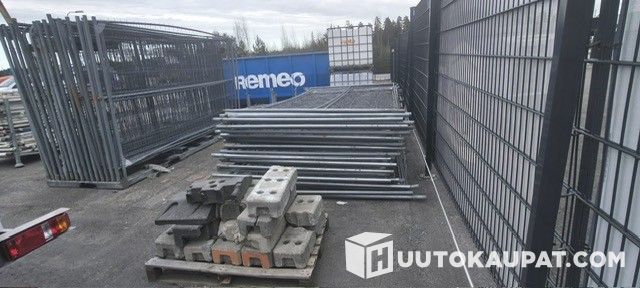 Työmaa aitaa, elementin koko pituus 3,5m ja korkeus 2 m. yht 63 kpl. muutama betonipaino mukana, näkyy kuvassa. Vääntyneitä, revenneitä, lommoja on kaikissa.