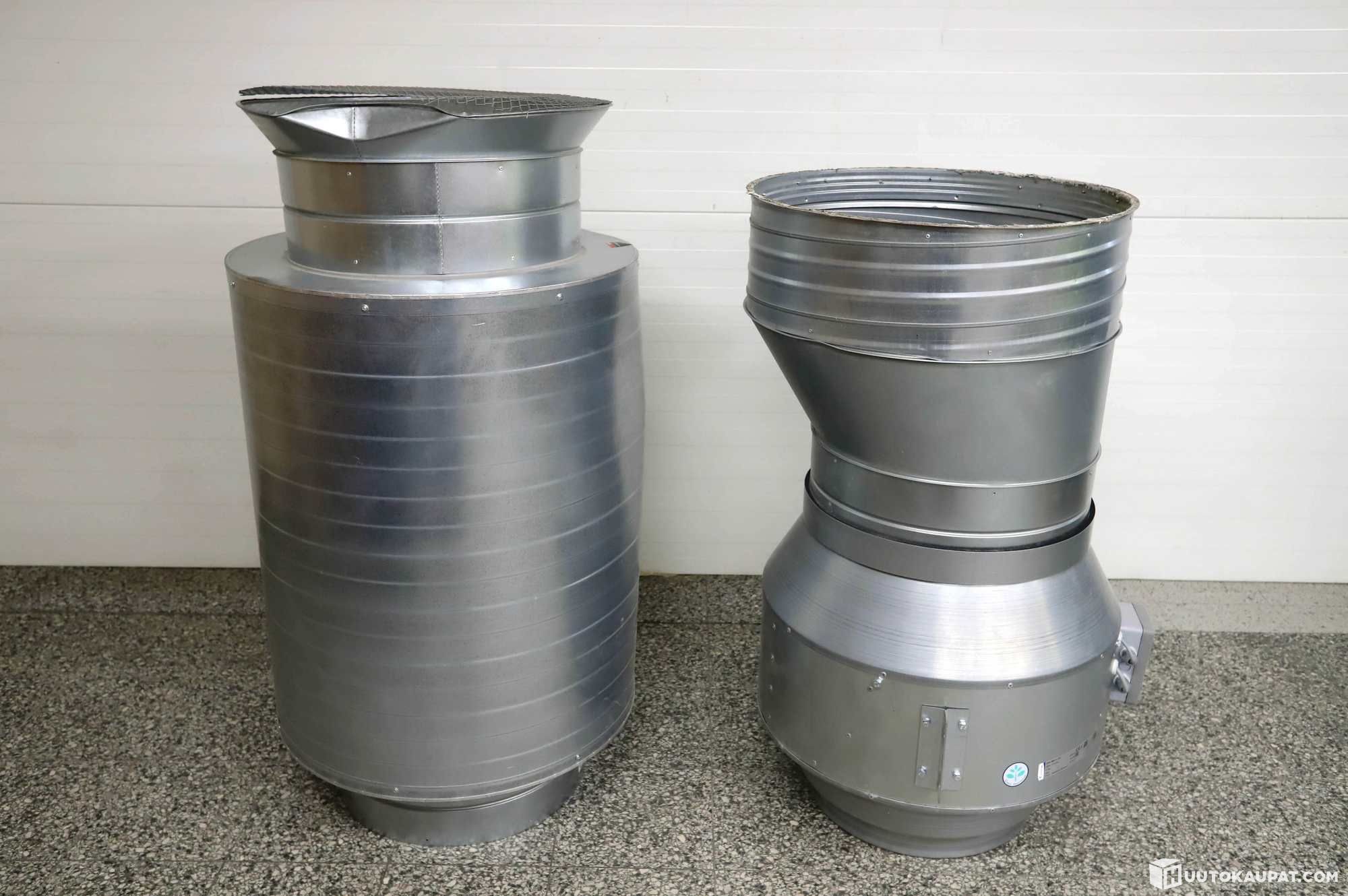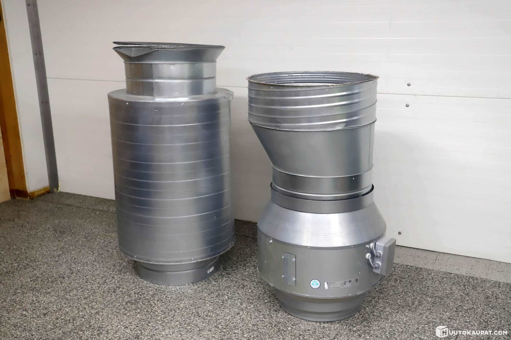SystemAir Prio 500 3 EC-kanavapuhallin. Pituus 120cm, halkaisija noin 65cm. Päätyjen halkaisijat noin 65cm ja 40cm.