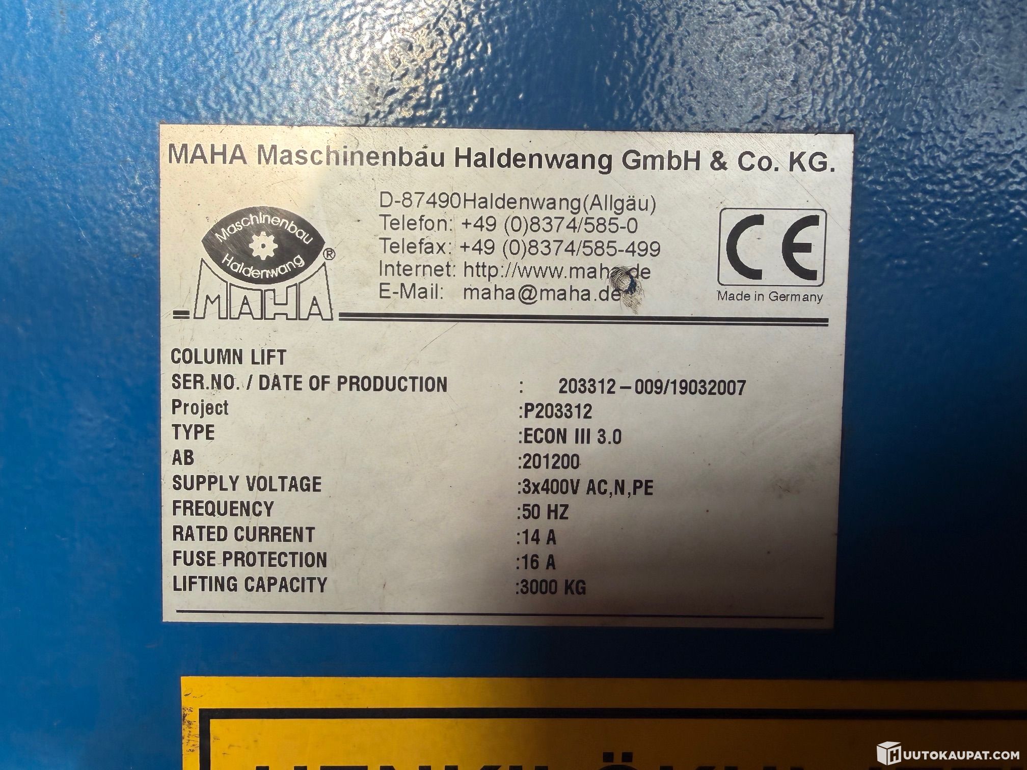 Tarpeettomaksi jäänyt Maha 3000kg 2-pilari nosturi. Ollut käytössä ja toimiva, katsastettu viimeksi 2021. Tolpat omilla moottoreilla. Ostaja purkaa nosturin, lastauksessa voidaan auttaa trukilla.