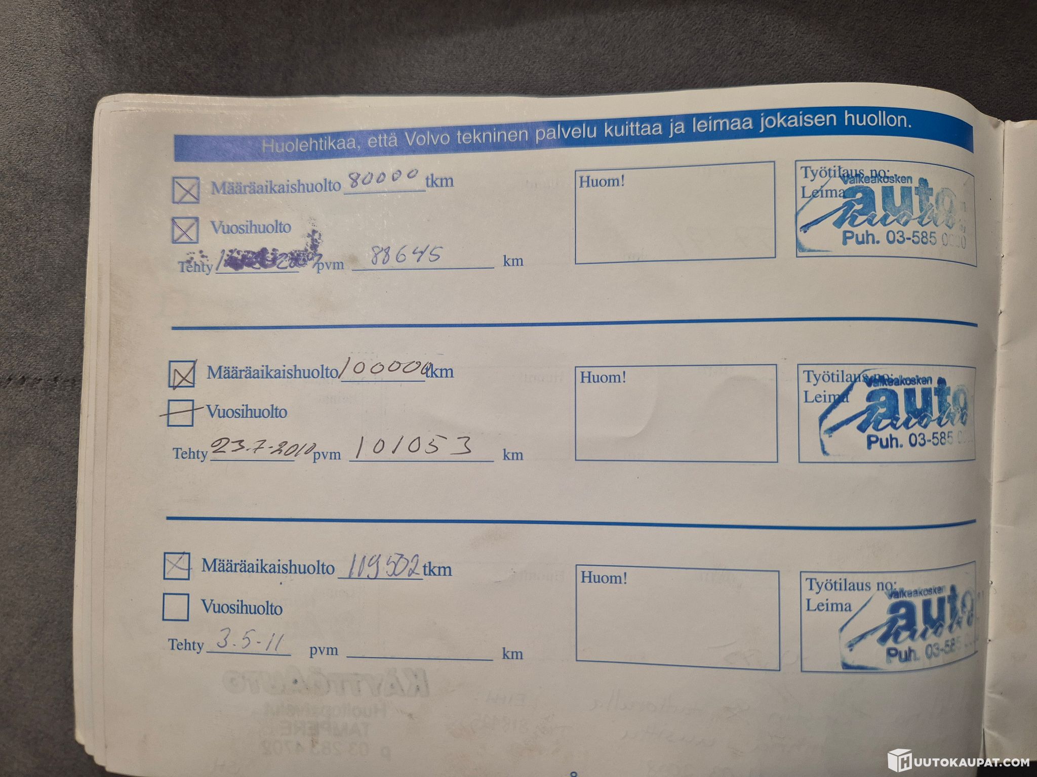 Säännöllinen huoltokirja: Autoa on pidetty ja huollettu tarkasti.