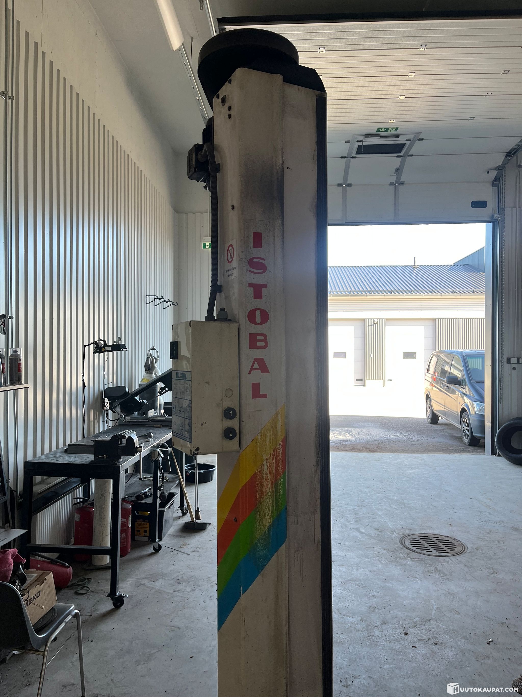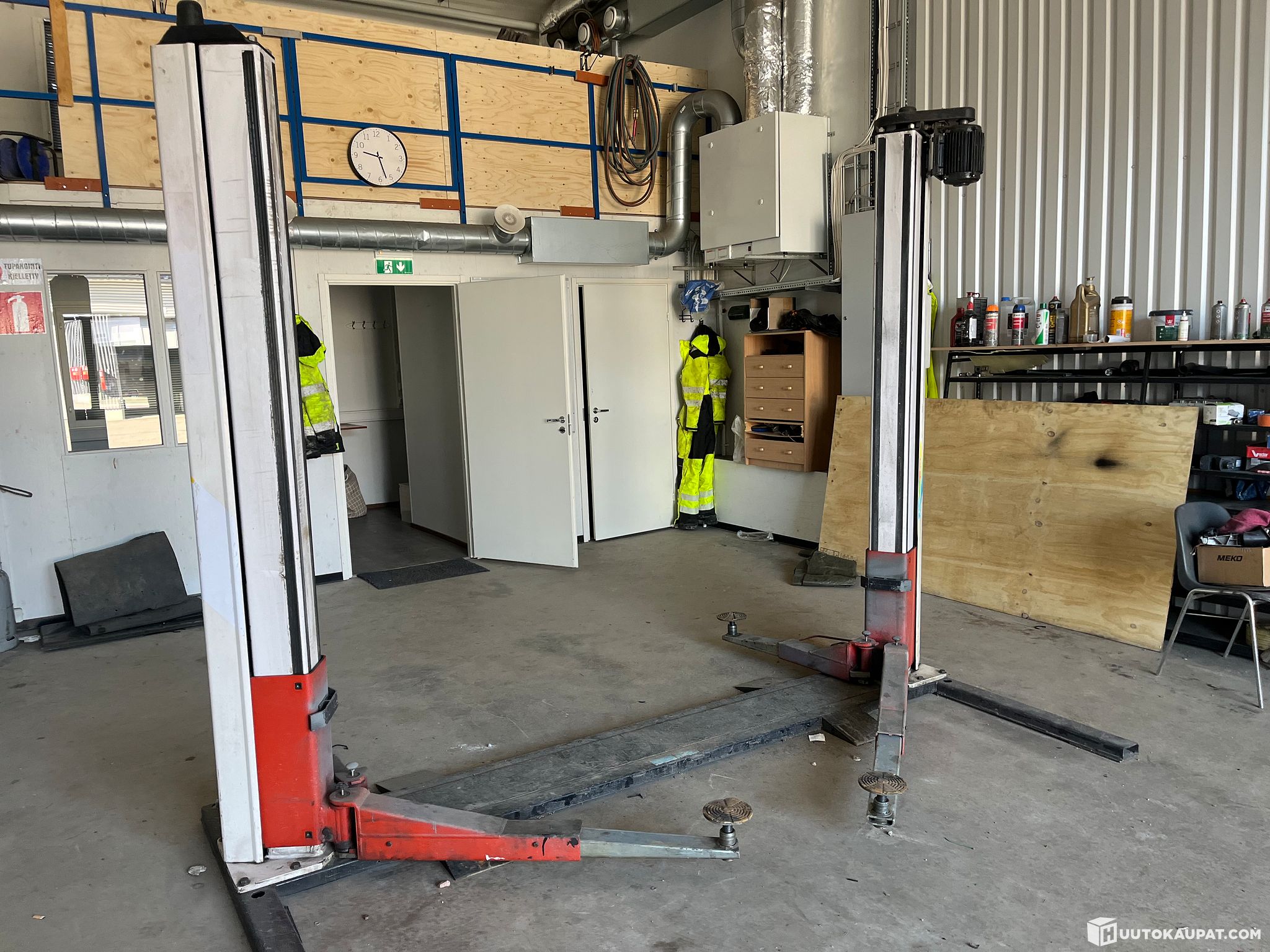 mm 2-pilari nostin ( ei ole kytketty sähköverkkoon), metalli vannesaha, työpöytä, rengasteline, pumppukärryt ym sek. tavaraa. Lisäksi 4 pakettia a’ 5 levyä Finfoam levyjä.