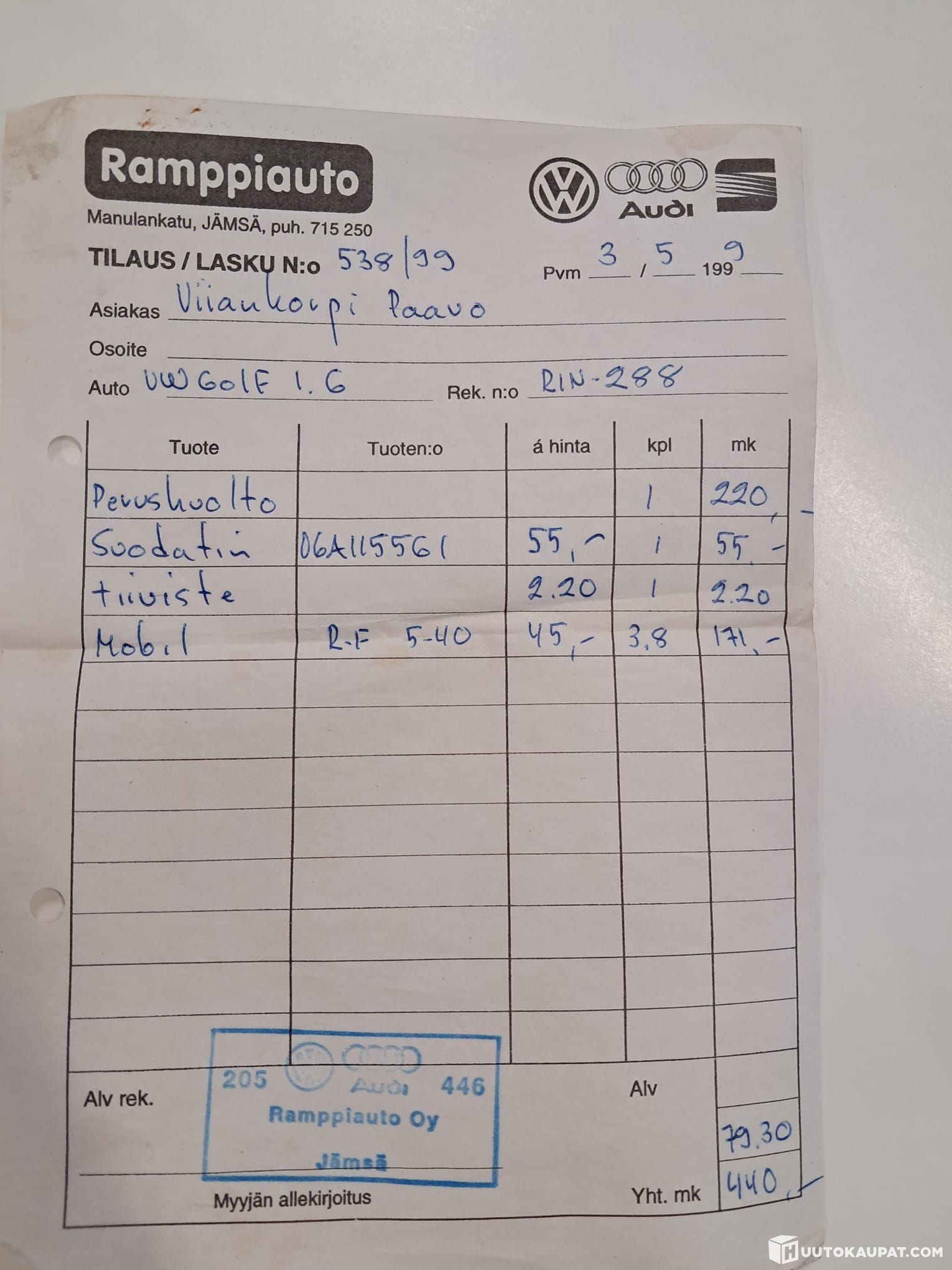 Tämän kohteen myyjä on Huutokaupat.com. Rinta-Joupin Autoliike Oy antaa Huutokaupat.comin puolesta kohteesta lisätietoja ja vastaa kohteen luovutuksesta. Kohde tulee aina maksaa Huutokaupat.com-sivustolla olevien verkkomaksupainikkeiden kautta tai Huutokaupat.comin laskulla. Jos kohdetta ei makseta Huutokaupat.comille, Huutokaupat.com ei hyväksy mitään vastuuta kaupasta.