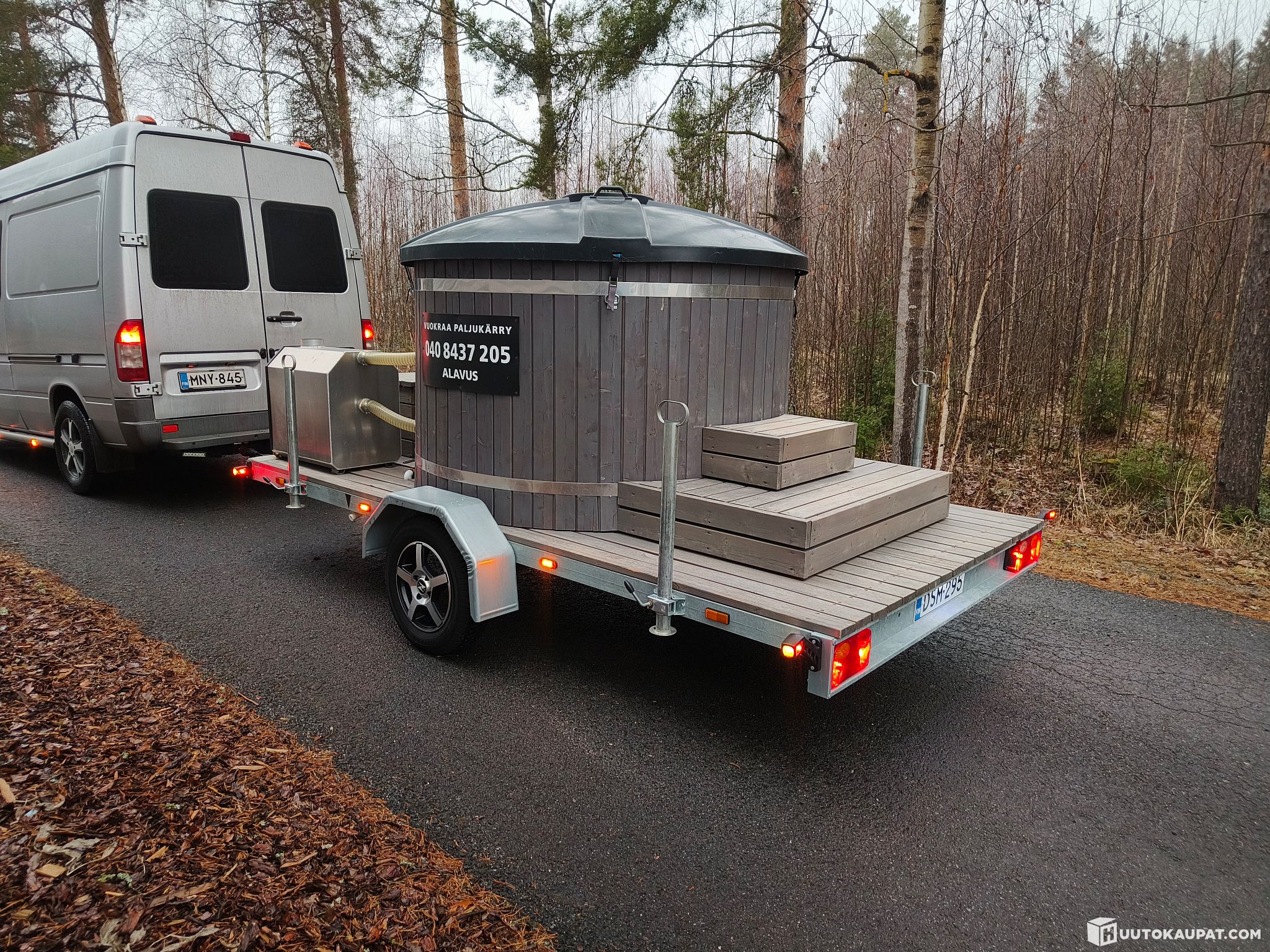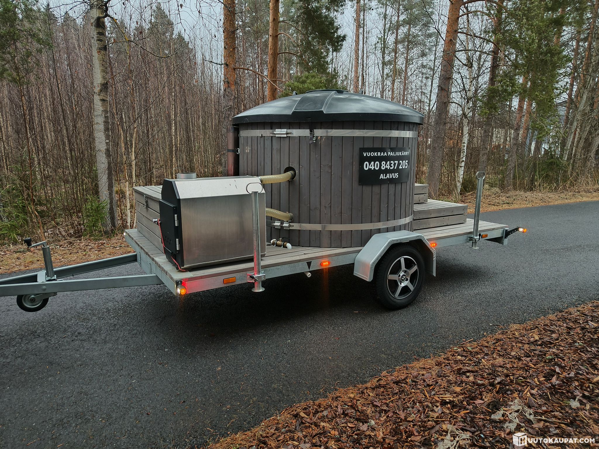 Vuokrakäytössä ollut paljukärry. Tämä on yksittäistyyppihyväksytty ja rekisteröity nimenomaan paljukärryksi.
