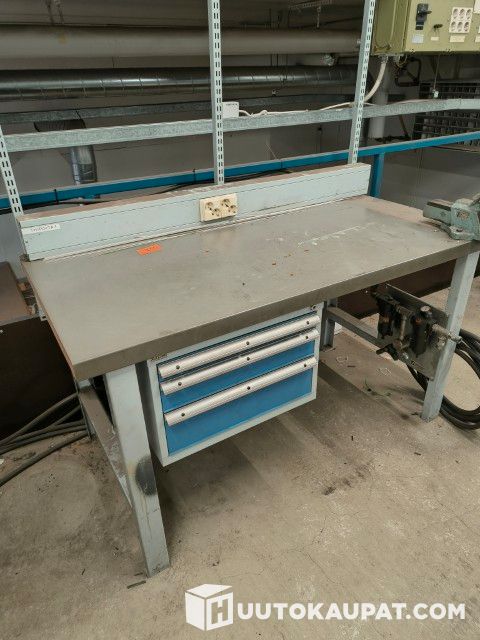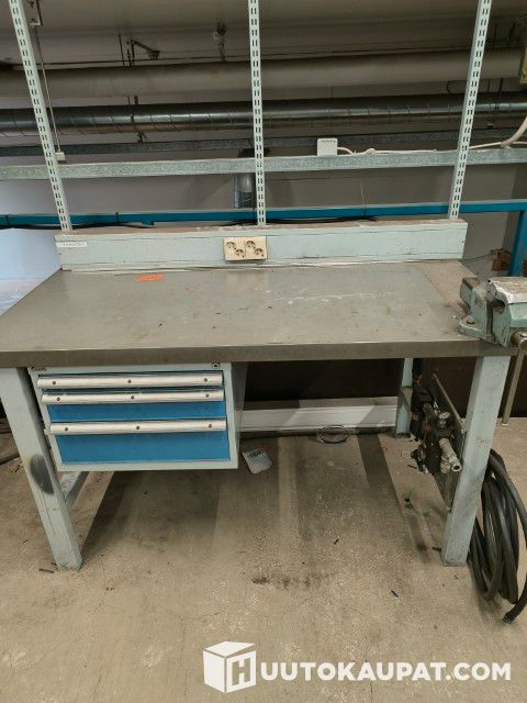 Myydään korjaamon poismuuton vuoksi GWS työpöytä, s 75 x l 150 x k 85, laatikosto ja ruuvipuristin. Sähkökotelo. Pystykiskot reikälevyjä varten