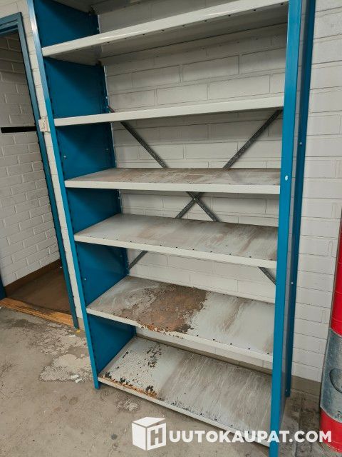 Peltihyllystö umpipäädyillä, hyllyjä 7 kpl, hyllyn koko 100 x 40 cm. Tolppien korkeus 203 cm