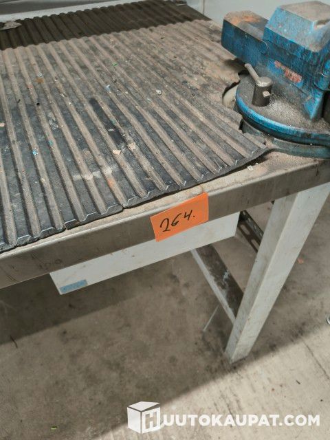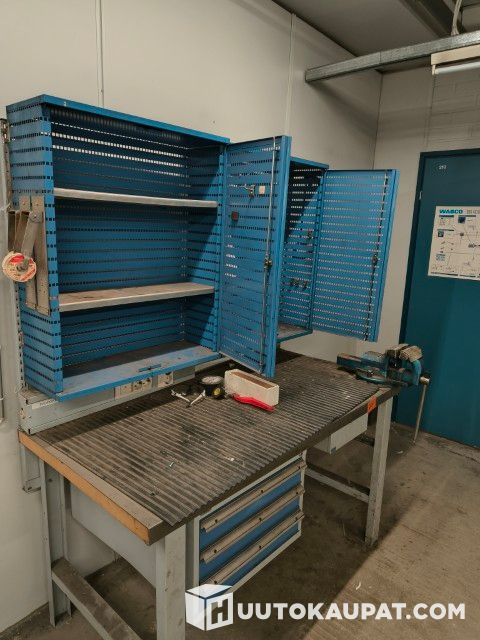 Myydään korjaamon poismuuton vuoksi GWS työpöytä, s 75 x l 150 x k 85, laatikosto ja ruuvipuristin. Sähkökotelo. Molemmista peltikaapeista puuttuu toinen ovi