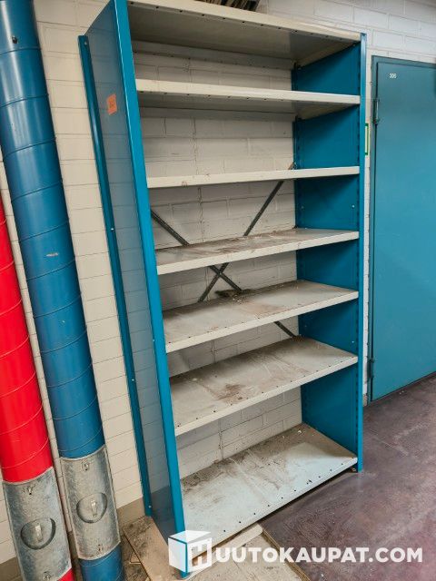 Peltihyllystö umpipäädyillä. 7 hyllyä, hyllyn koko 100 x 40 cm. Tolppien korkeus 203 cm