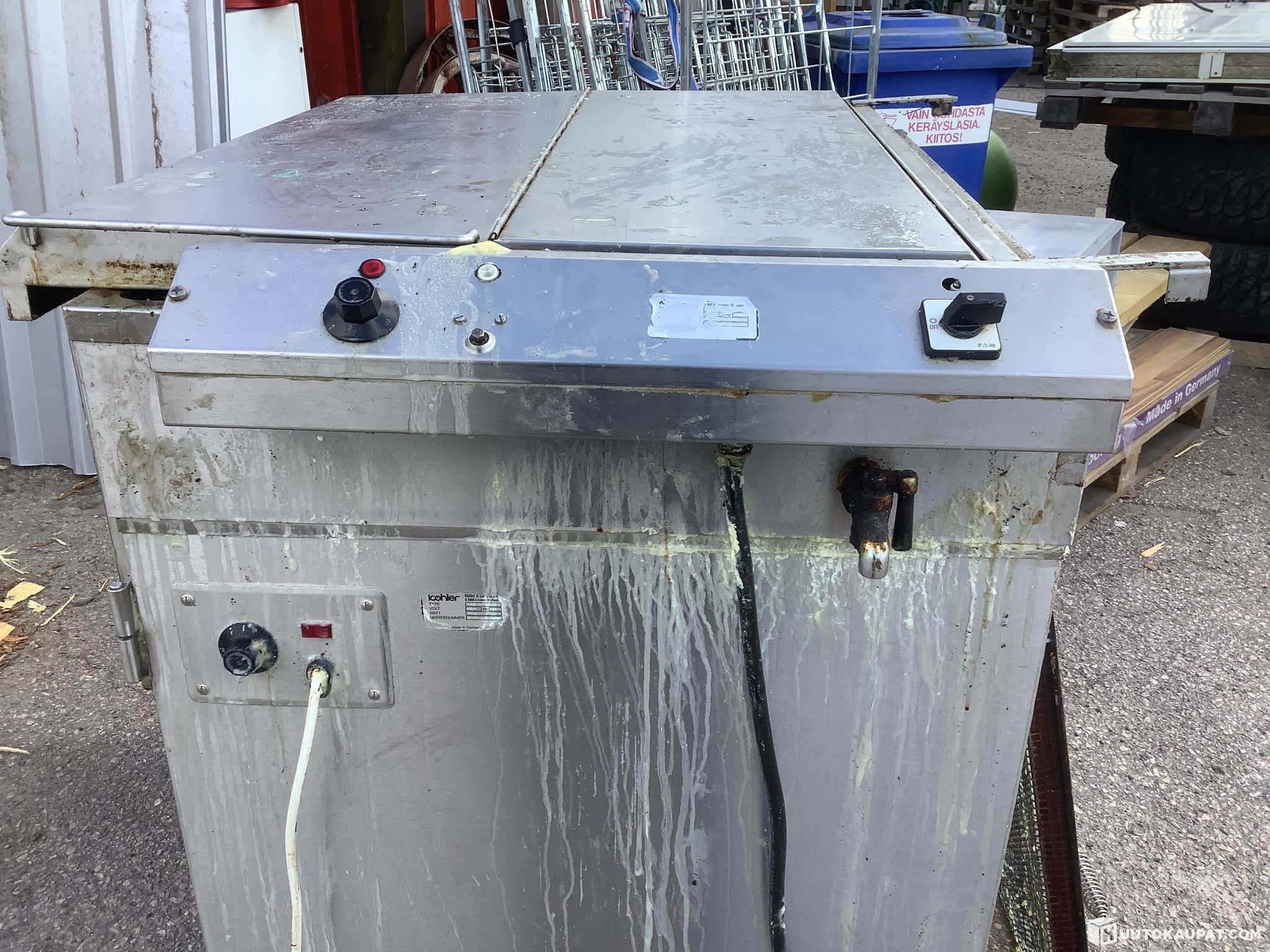 Munkkien valmistukseen köhler merkkinen pata jonka teho 900w .padan pituus 100cm leveys 80cm ja korkeus 110cm ..laitteen kaapeista löytyy munkki peltejä useita