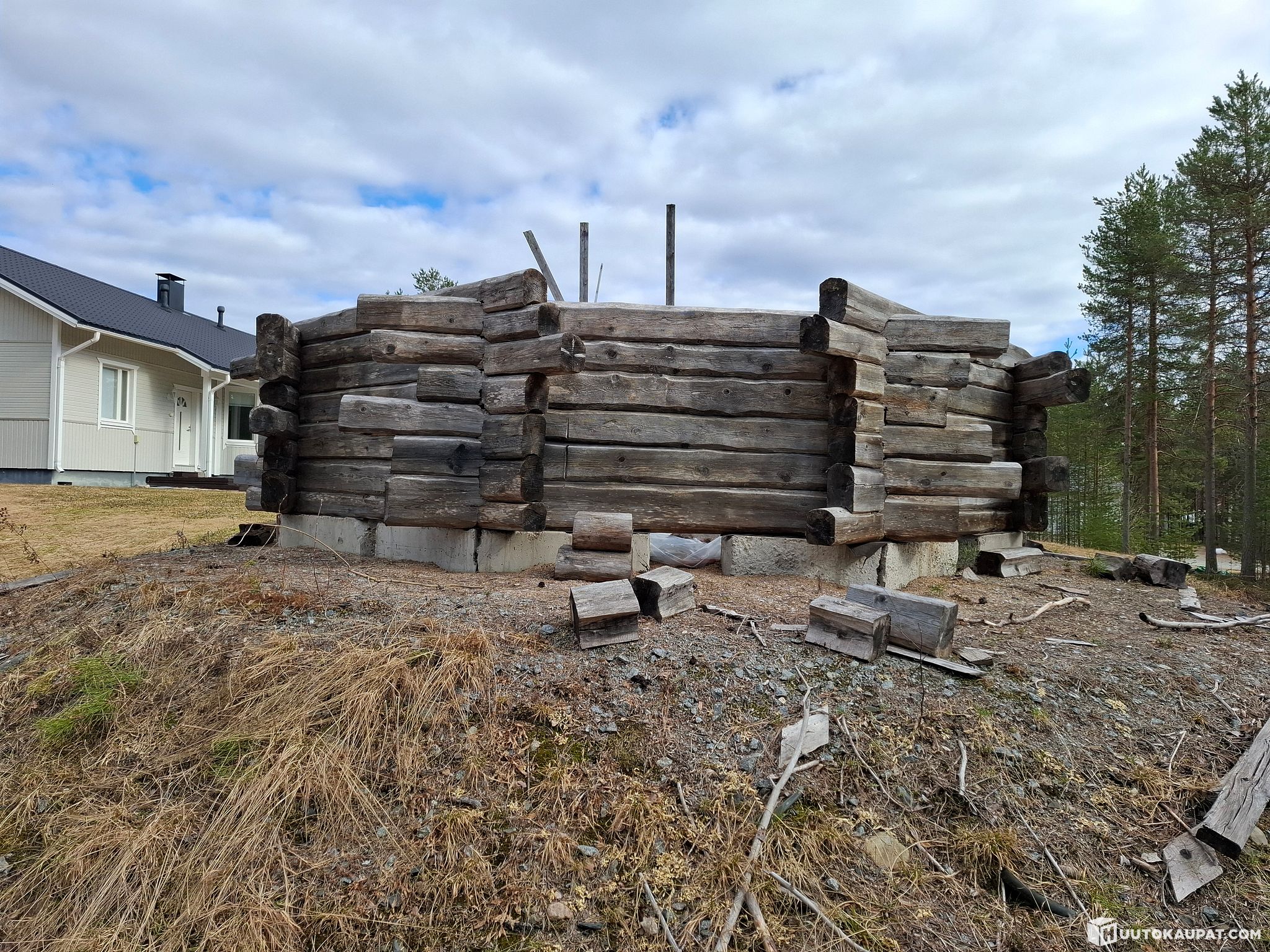 Myydään siirrettäväksi keskeneräinen 8 kulmainen hirsikehikko ja nippu hirsiä