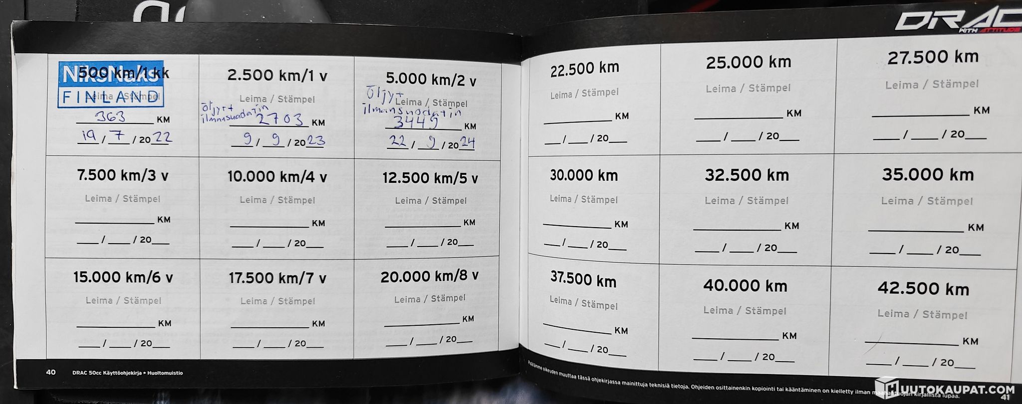 Mukaan uusi ilmansuodatin, käyttöohje/huoltokirja sekä huoltopukki.