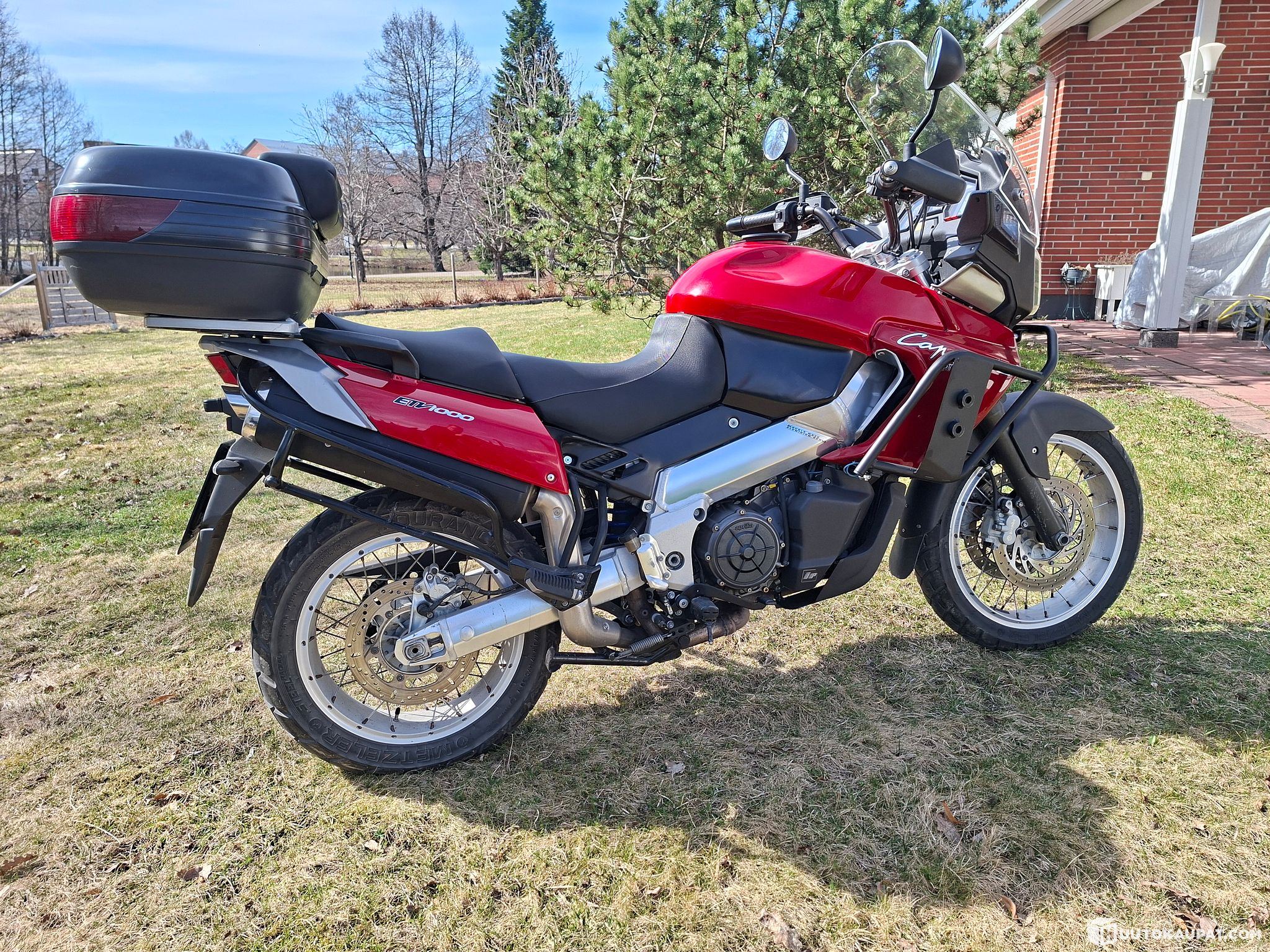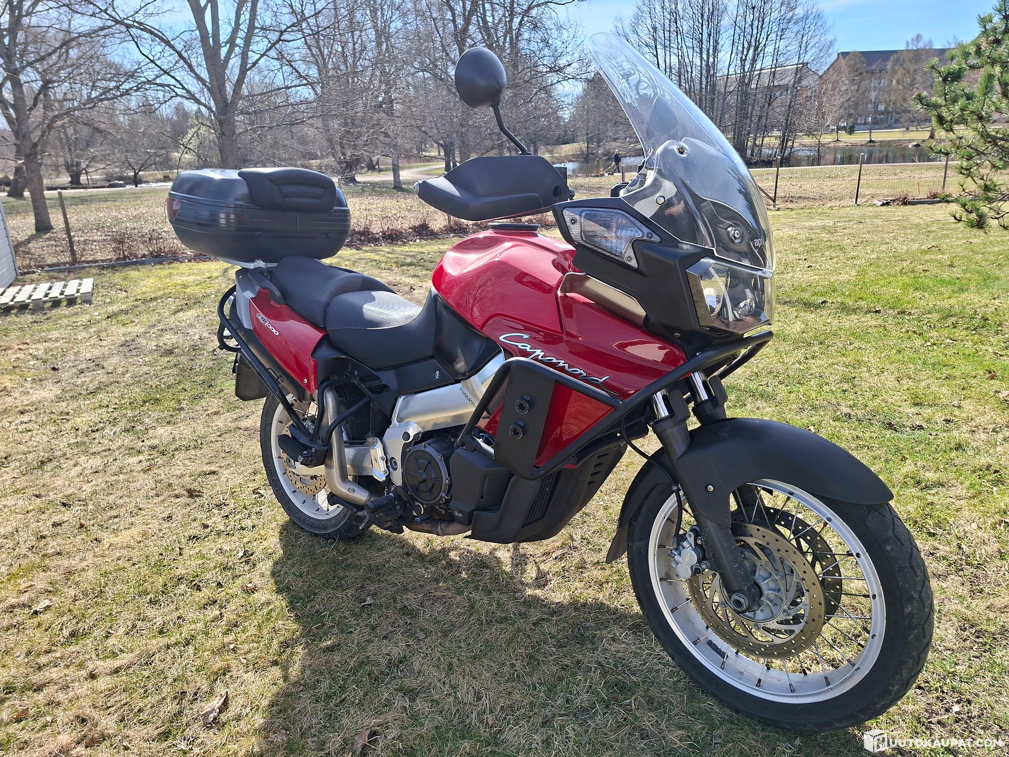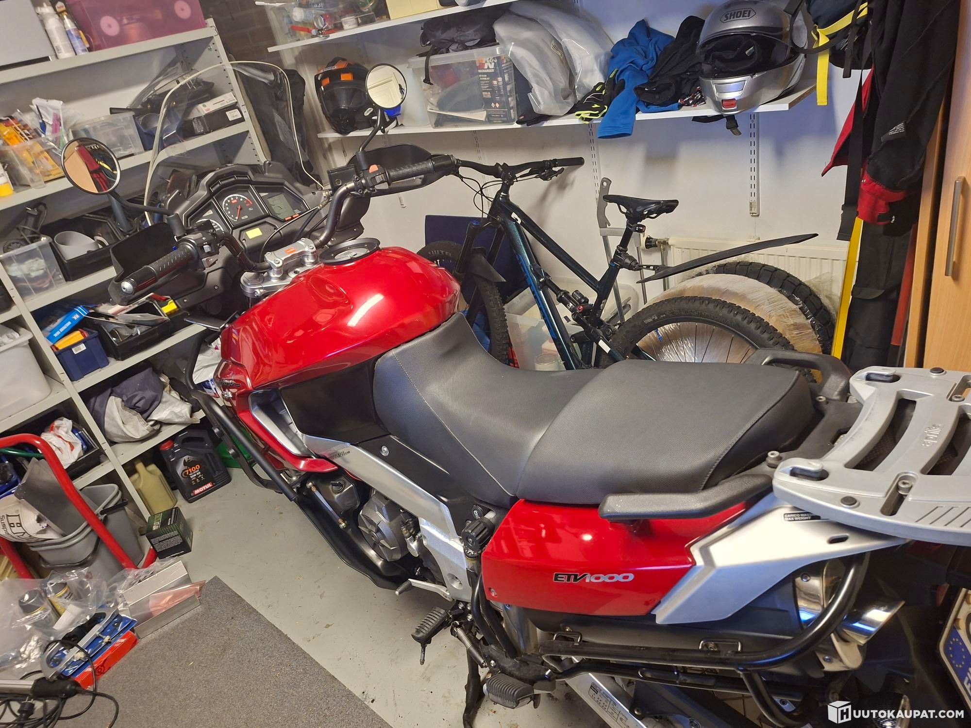 Varusteena; virran ulosotto, takalaukku, Aprilian sivulaukut tosin väri poikkeaa jonkun verran punaisesta muusta pyörän väristä.