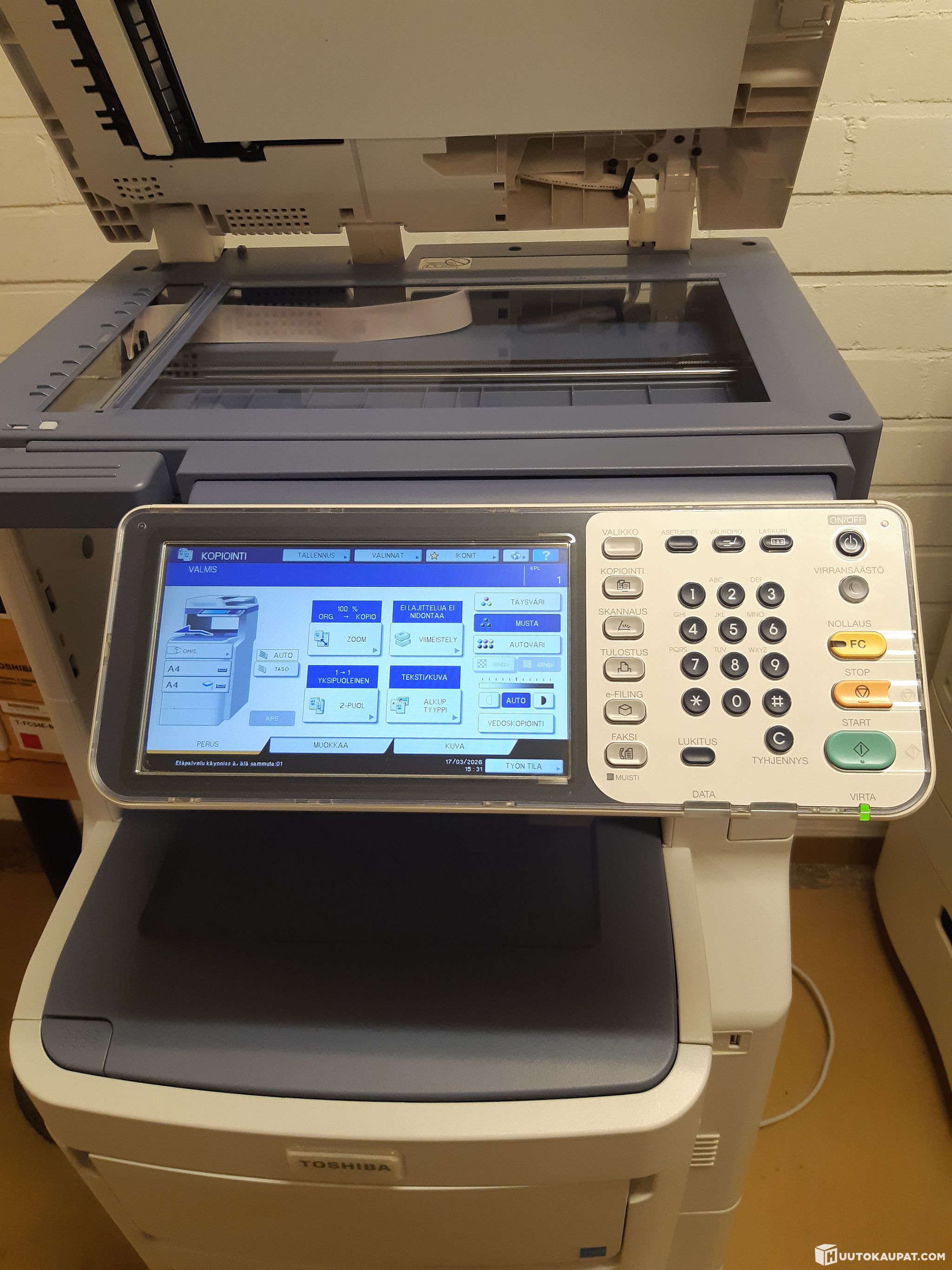 Vähän käytetty monitoimitulostin vain 13000 sivua. Kopiointi tulostus ja skannaus verkko ja usb liitin kaksi paperikasettia ja ohisyöttö koneessa olevat värit M 90 % C 80% M 100 % Y 50 %