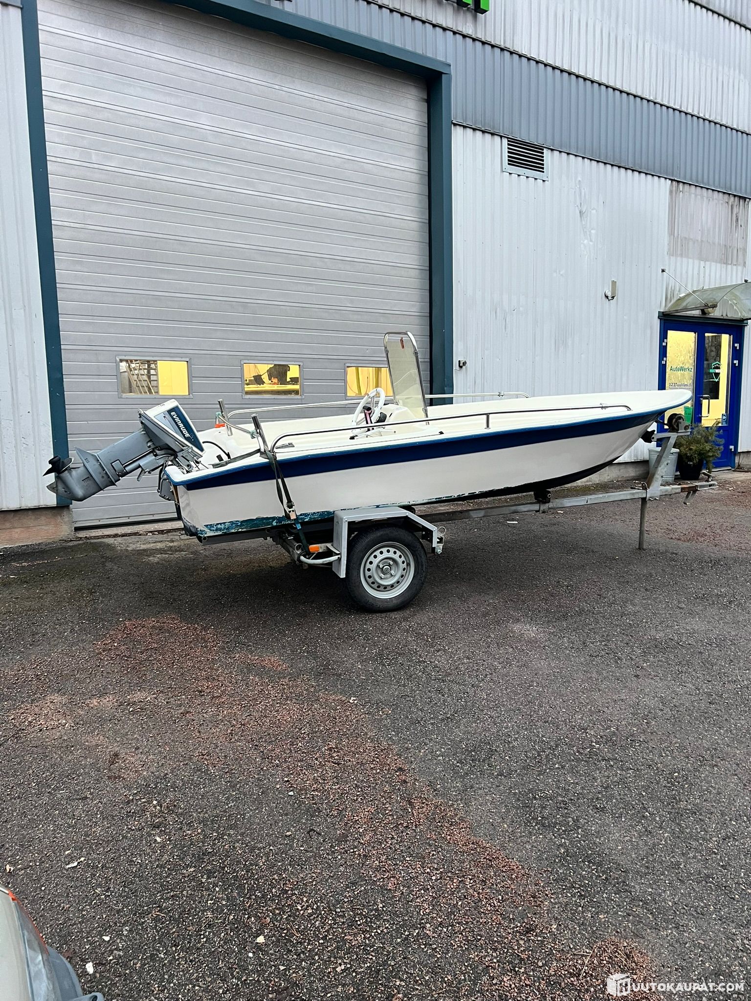 Noin 4,2m pitkä. 1.6m leveä. Perässä Evinrude 9,9hp