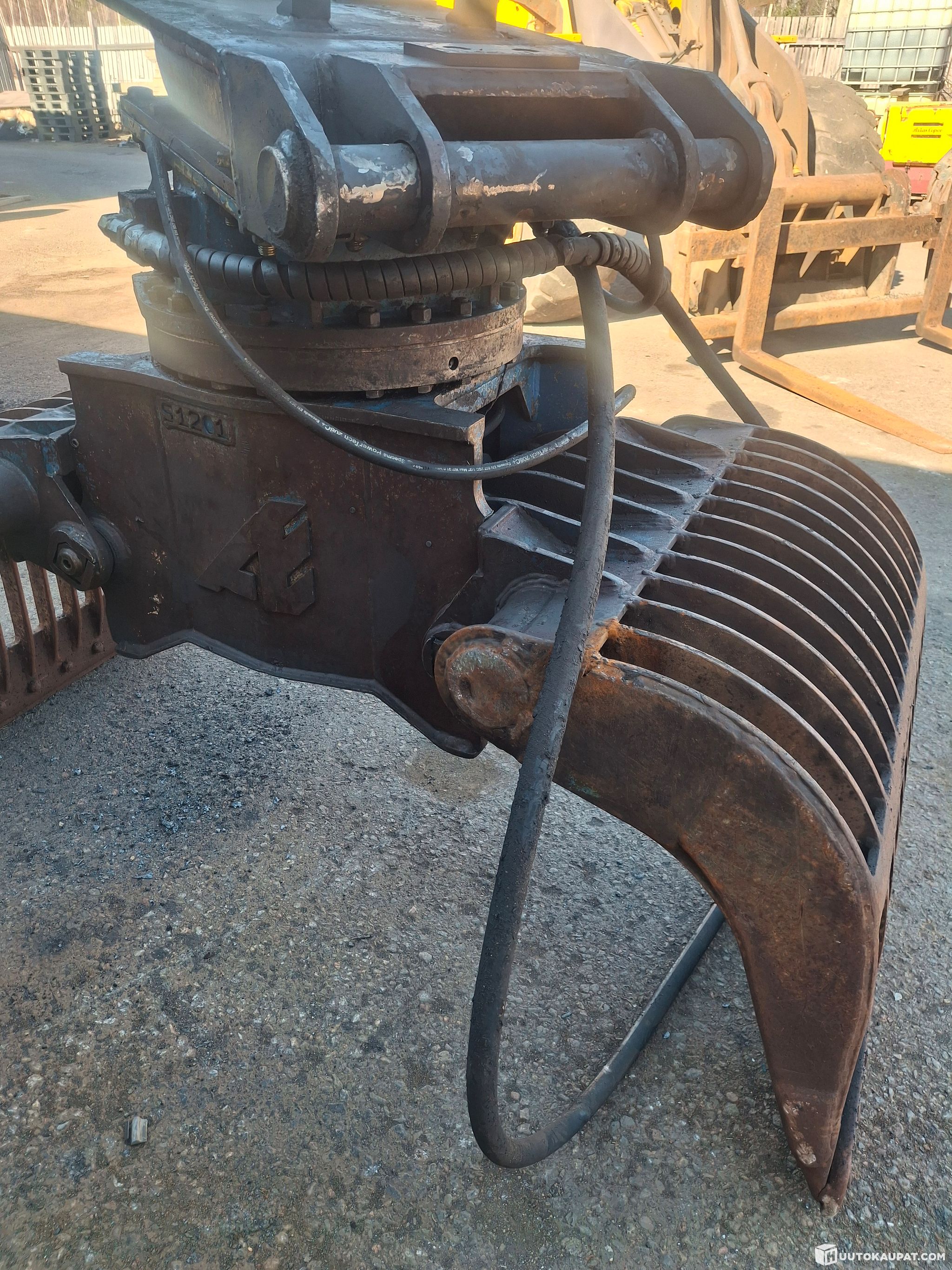 Materiaalikoura Arden S1201 laatumerkki.Käytön tuomaa kulumaa kuitenkin toimintakunnossa. Paino 1500kg kiinnike Ntp20 sopii 16-20t kaivinkoneeseen aukeama1,5m leveys 1m