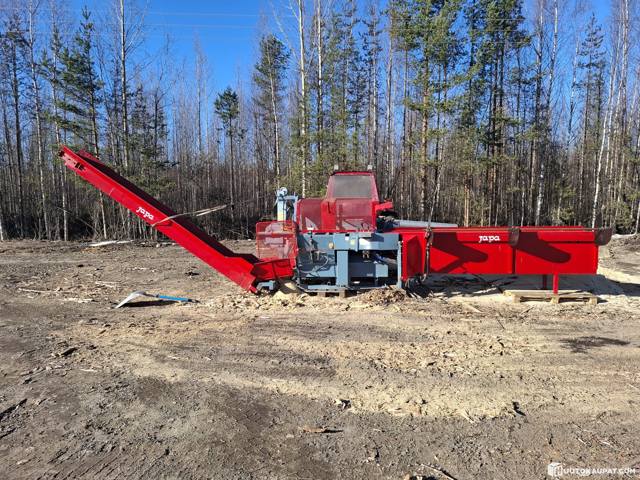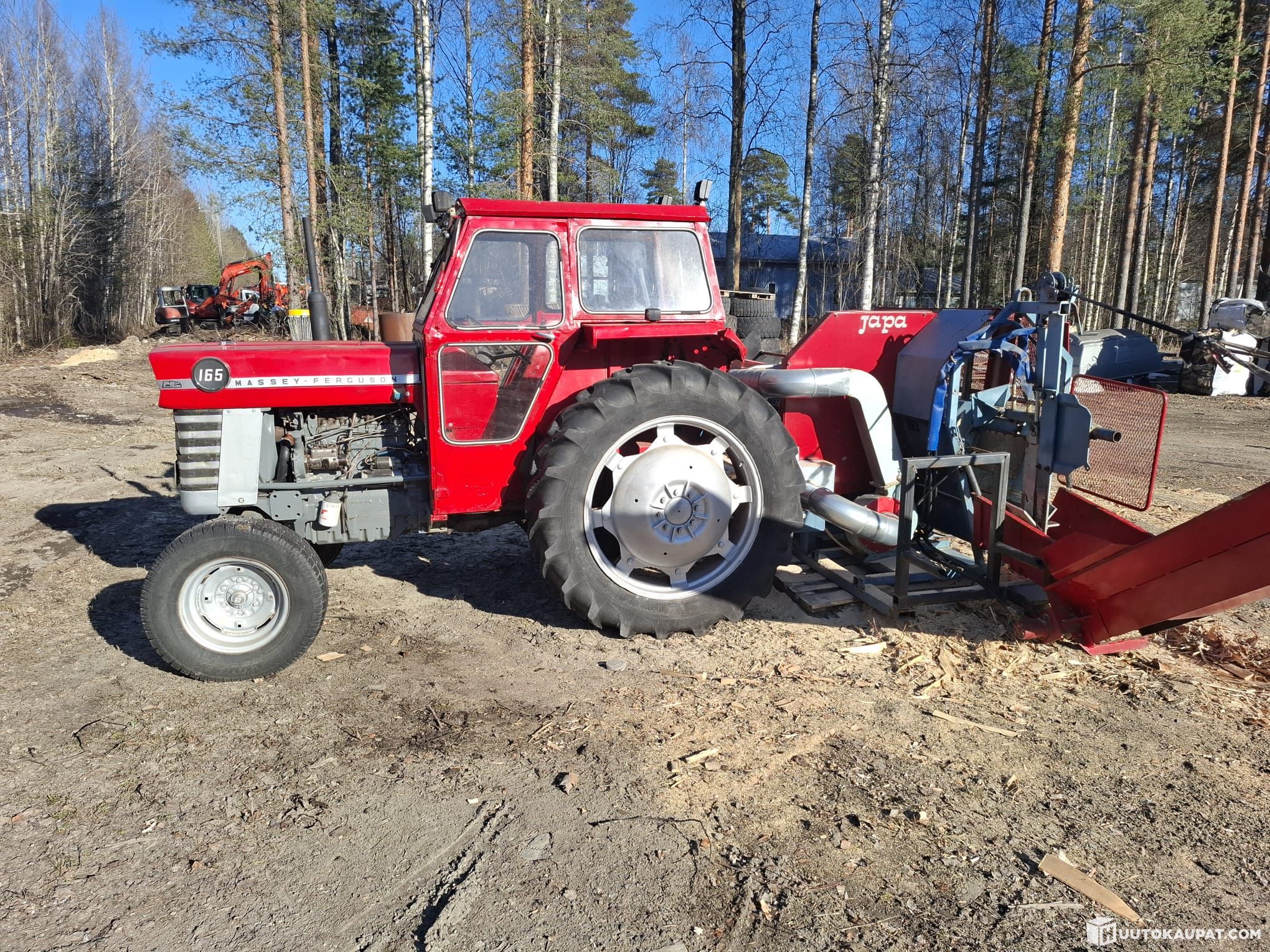 Japa 1703, Massey Ferguson 165 ja tukkipöytä. Massikassa uusi vesipumppu, jäähdytin, termostaatti ja kaikki valot. Kaikki öljyt ja sudattimet vaihdettu. Ei huohota tai savua. Japassa hydraulinen halkaisuterän korkeuden säätö, hydraulinen tiputus pelti, Hydraulinen katkaisuvaste, hydraulinen syöttö- ja poistokuljetin, hydraulinen tukin annostelija ja purupuhallin.
