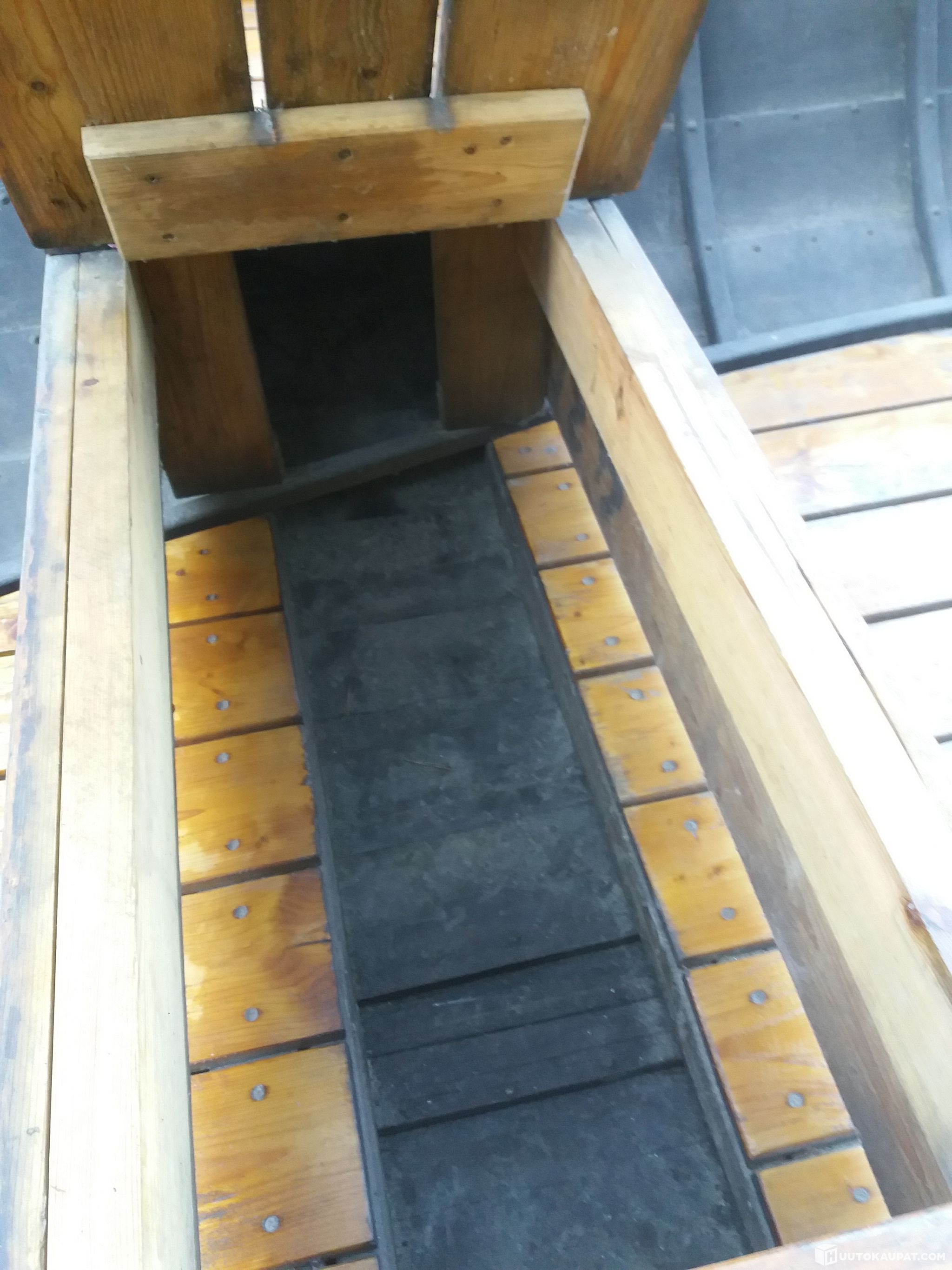 Mitat veneelle: pituus 4,65m ja leveys 1,75m. Etu- ja takapenkin alapuoli on avoin, mutta keskipenkin alla on lukittava säilytystila.