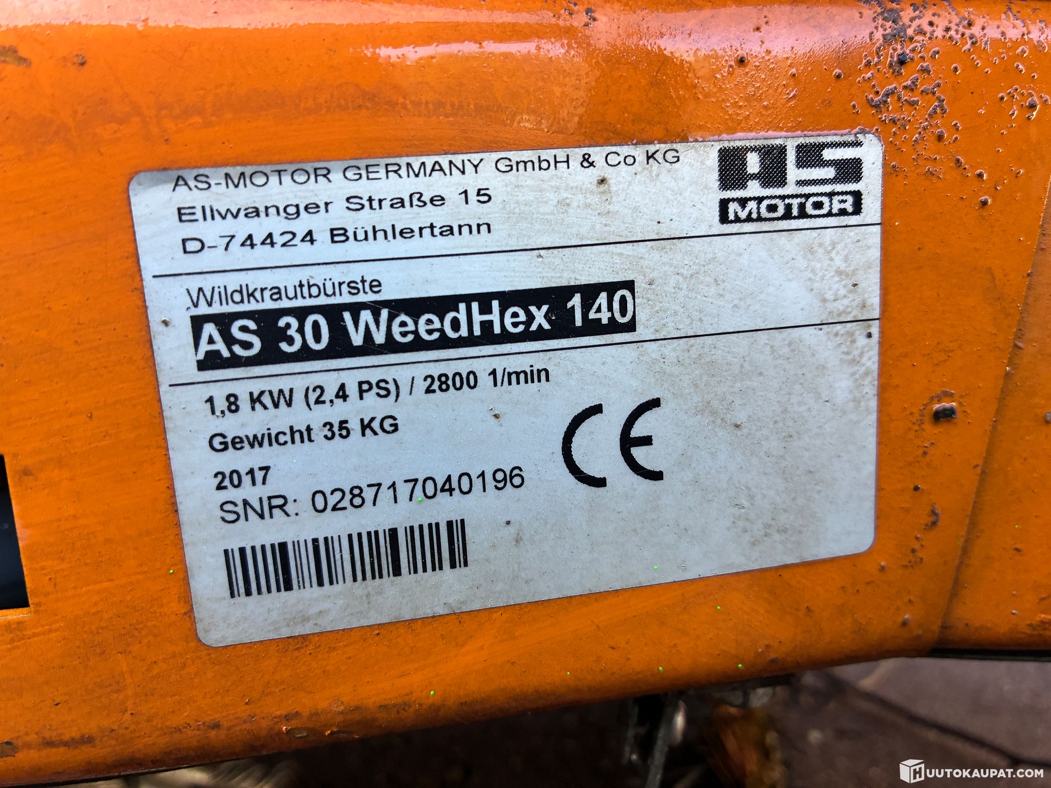 Valmistaja As Motor ( Saksa), 1,8 kW:n teho, työleveys 35 cm, pyörintänopeus 600 rpm