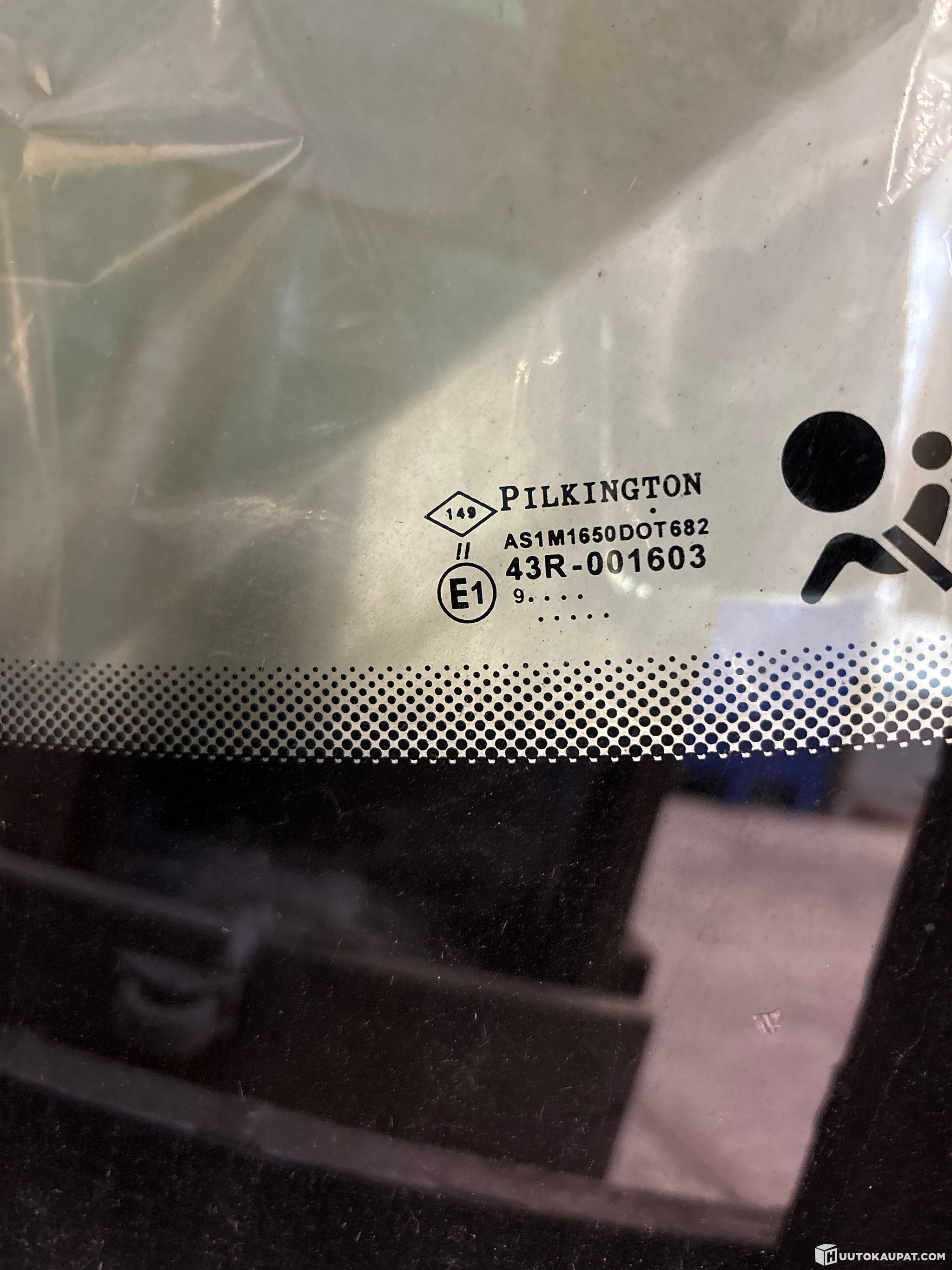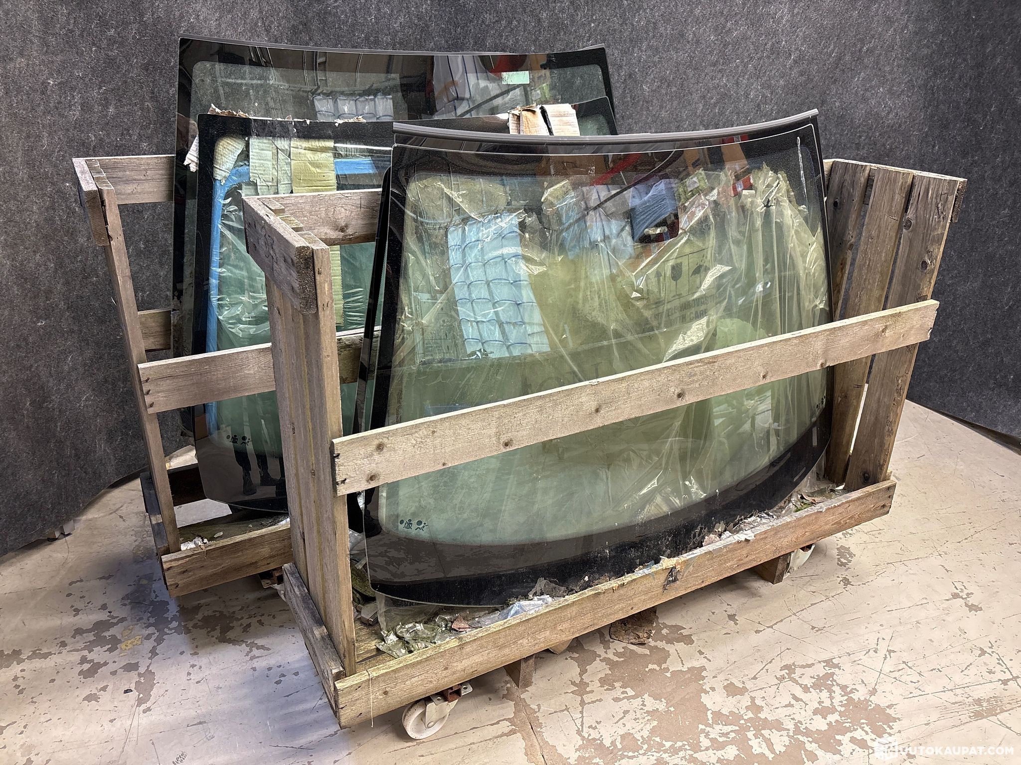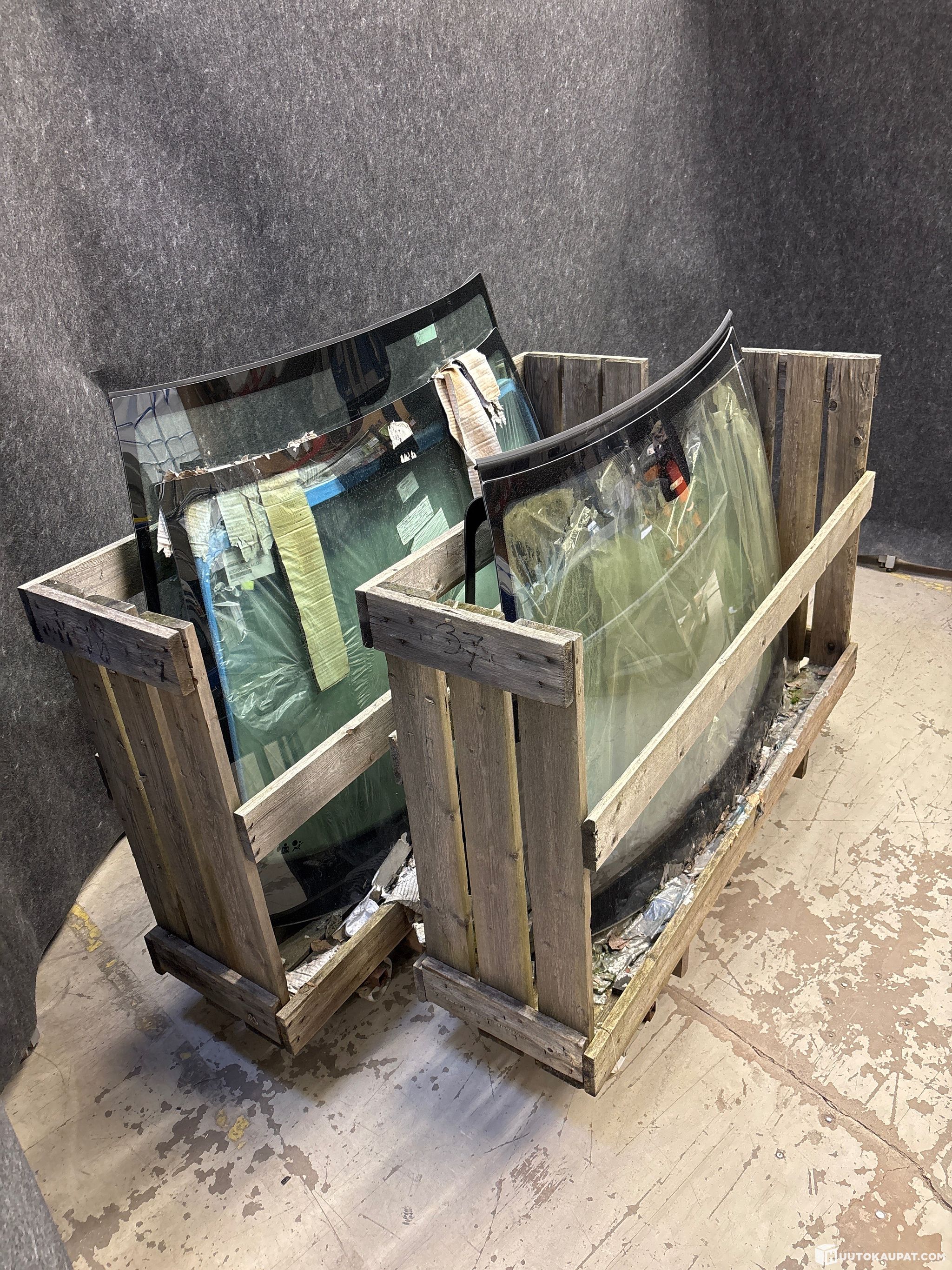 6kpl ajoneuvon tuulilaseja/ikkunoita. Vain yhdessä on selkeälukuinen tieto merkistä ja mallista. Lopuista laput irronneet tai tekstit kuluneet pois.